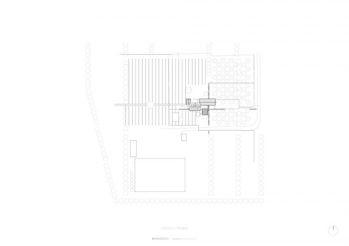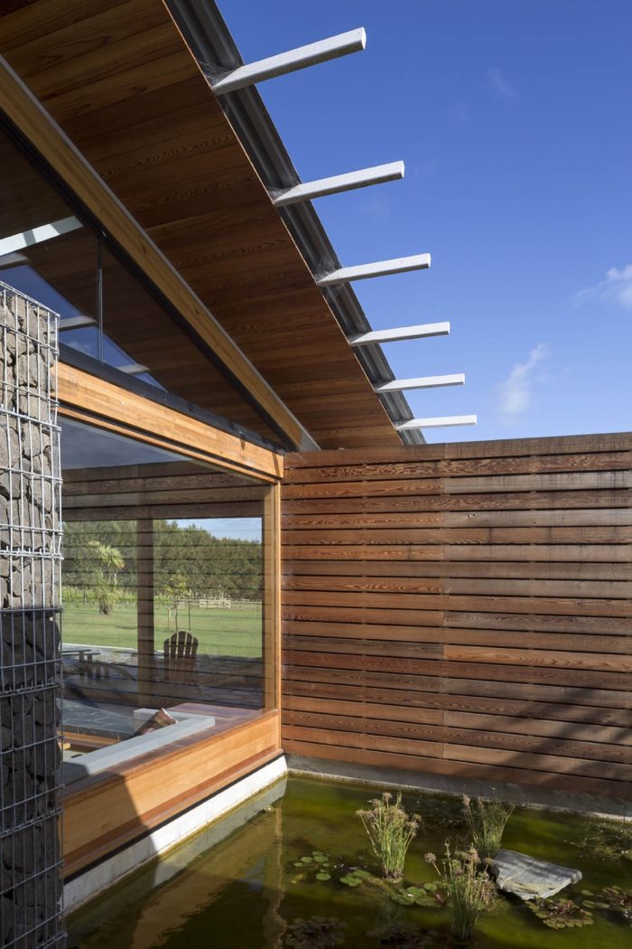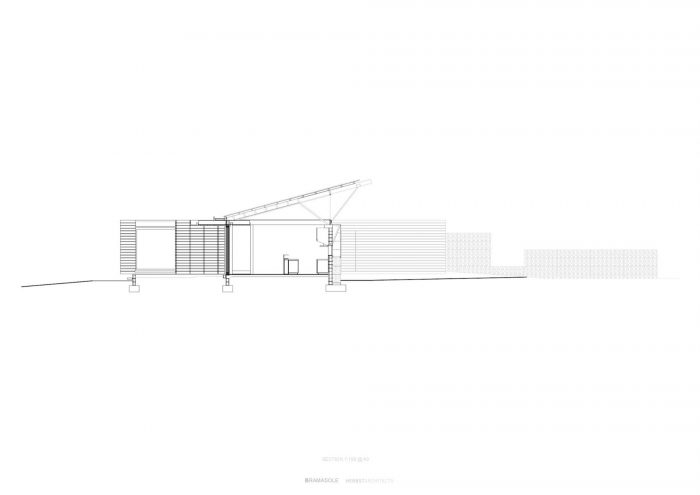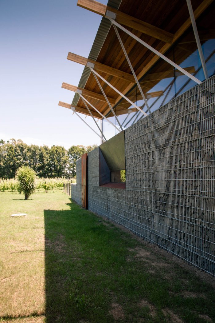The house is elevated on a blockwork plinth to lift it out of the potentially soggy homogenous land. This height allows the boxes to oat, gives the occupants a view over the vineyards and brings them closer to the eye height of the horseman. The plinth, intersected and edged by the gabions serves to blind the positive and negative spaces.