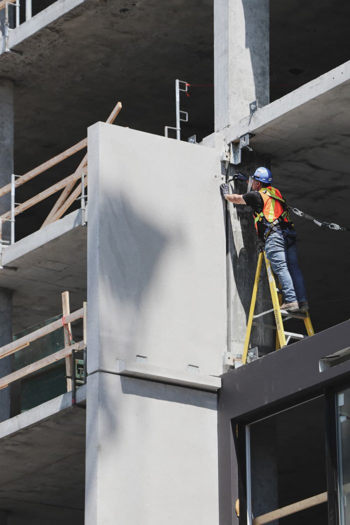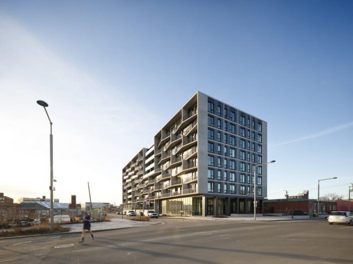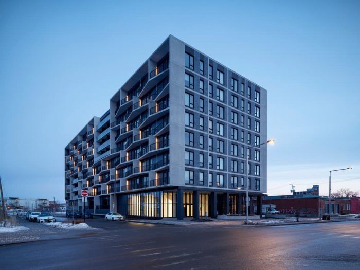 “The integration of balconies in the architectural composition of a residential building is always a great challenge and even more in the case of this project since we wanted to create a building imbued with the industrial architectural language of the neighboring buildings,” notes Frappier. The horizontal portion of each balcony attaches to one side of the structure, with deeper parts suspended by a vertical attachment to the concrete panel that houses the windows. With ACDF’s use of a precast system, even the building’s dark manganese brick is cast into the concrete panel. The quality and performance of the precast system is absolutely perfect, and the ease of assembly simplified the process of maintaining the rough façade that we envisioned,” says Frappier. “It’s almost disconnected, and the building experiences greater efficiency due to fewer interventions in the thermal bridge.