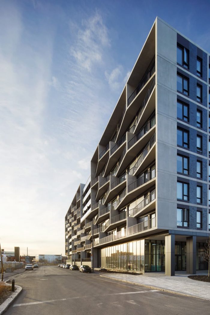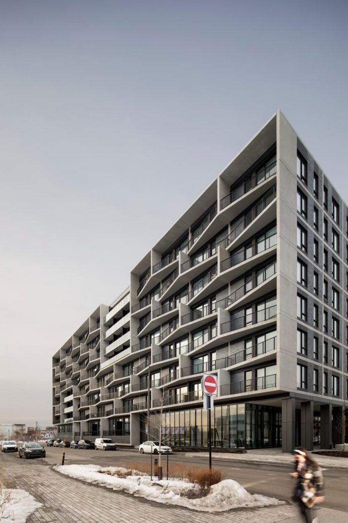 Frappier指出:"在住宅楼的建筑构成中整合阳台总是一个巨大的挑战,在这个项目中更是如此,因为我们想创造一个充满了邻近建筑的工业建筑语言的建筑,"。每个阳台的水平部分连接到结构的一侧,更深的部分通过垂直连接到容纳窗户的混凝土面板上悬挂。由于ACDF使用了预制系统,甚至建筑的深锰砖也被浇铸在混凝土面板上。Frappier说:"预制系统的质量和性能绝对是完美的,而且装配的简易性简化了保持我们所设想的粗糙外墙的过程。"它几乎是断开的,由于减少了对热桥的干预,建筑体验到了更高的效率。
