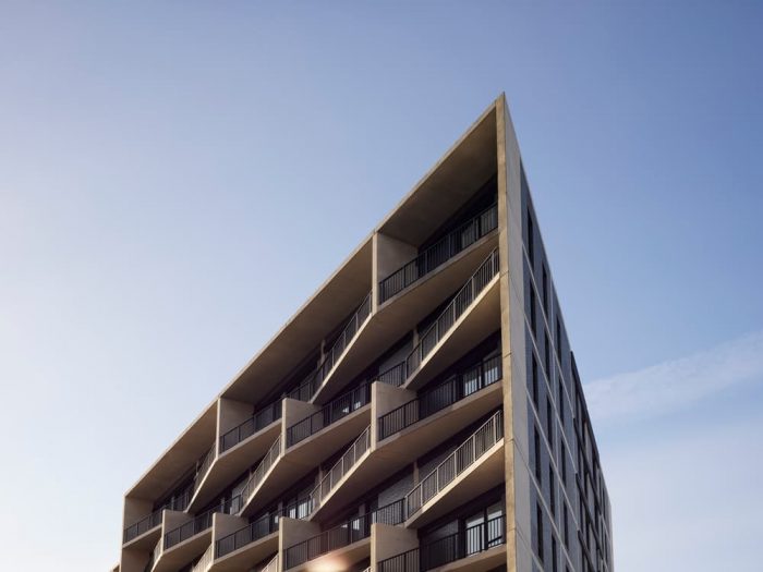 Vivre以一种安静的自豪感出现在旧货场的场地上,它是按照其邻居的形象来构思的。为了呼应场地的工业历史,ACDF采用了该区历史建筑的工业足迹,通常设计成混凝土结构网格,根据功能需要用砖和玻璃填充。在采取这种方法时,ACDF从建筑周围的工业语言中获得灵感,开始了现代的重新诠释。Vivre采用了裸露的混凝土网格的形式,但使用了ACDF定制的预制三板系统。砖块和窗户填充了网格的南北立面,面板系统促进了从混凝土网格中拉出一系列三角形阳台的过程。