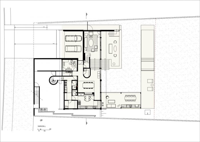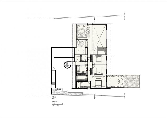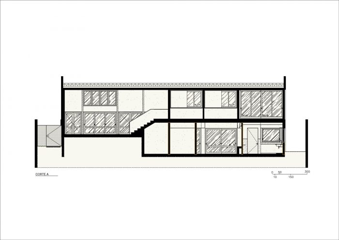 The main access was also changed; the social entrance that previously led to the lower floor was modified to give access to the intermediate level, through a walkway created in the side setback.