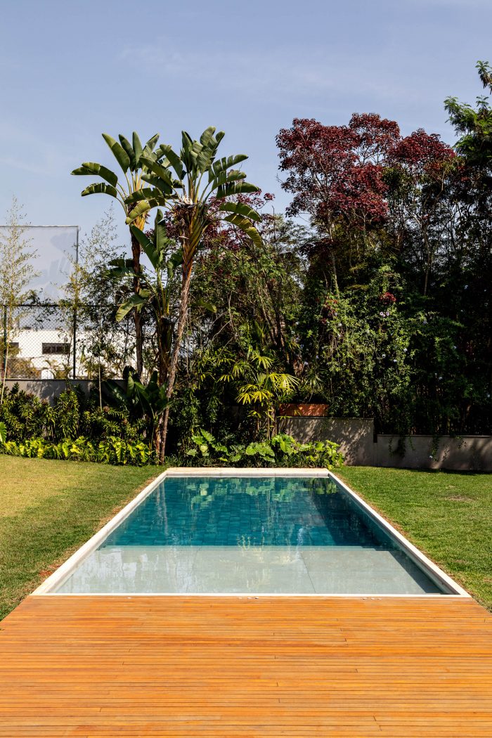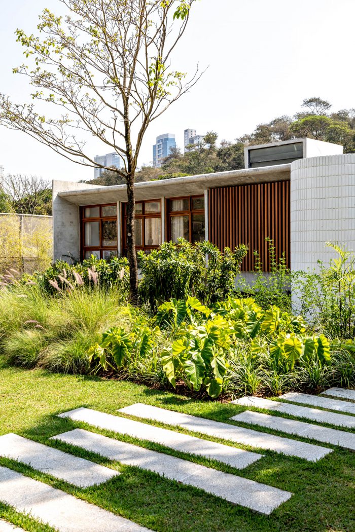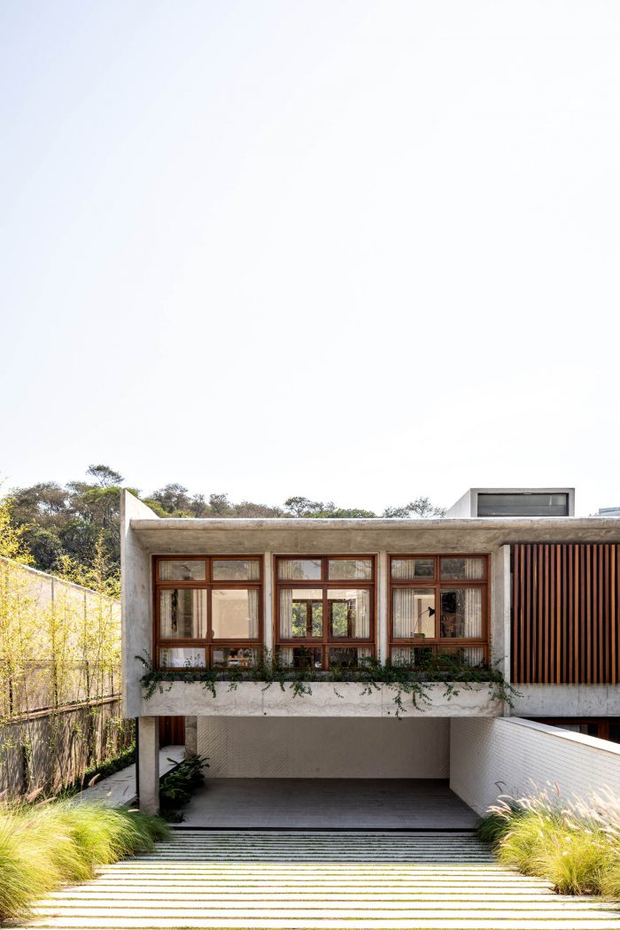The house, designed in the 1980s by Henrique Cambiaghi, attracted the client for the beautiful design of the concrete structure, the large wooden windows, and the view of the trees at the back of the land.