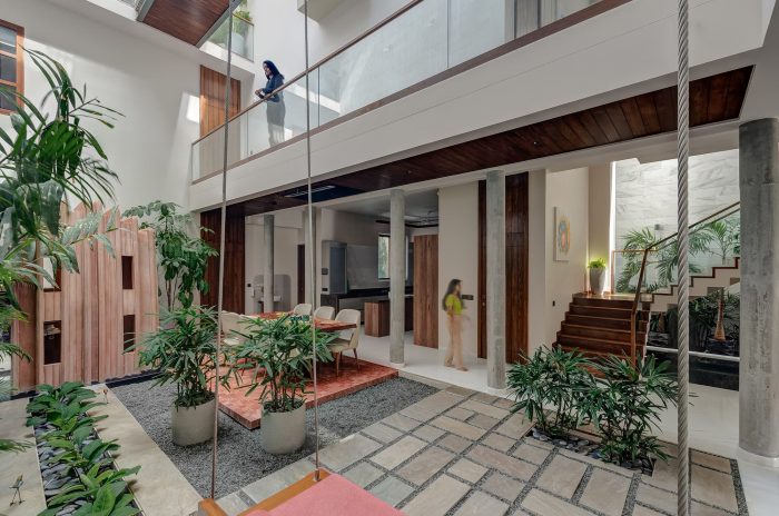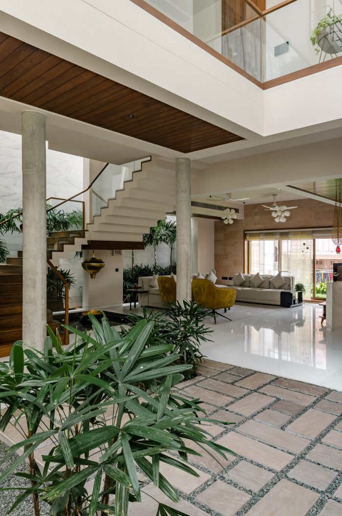 Section Play - Traditionally defined as a roofless space that is either enclosed completely or partially by walls, the courtyard provides a cool, secluded area to socialize or relax outdoors, but within the home. The widespread pergola at the Chiratan house ensures this comfort on all levels with the help of sectional play. Hot air rises up via the courtyard and leaves the premise from the windows installed in the terrace parapet. This ensures comfortable living temperatures and daylight in each part of the house throughout the day. The space narrates clients' love for natural elements, like water, natural light, and greens. The boundary between open and closed space fades through the use of open planning and bringing in green alleys inside the house.