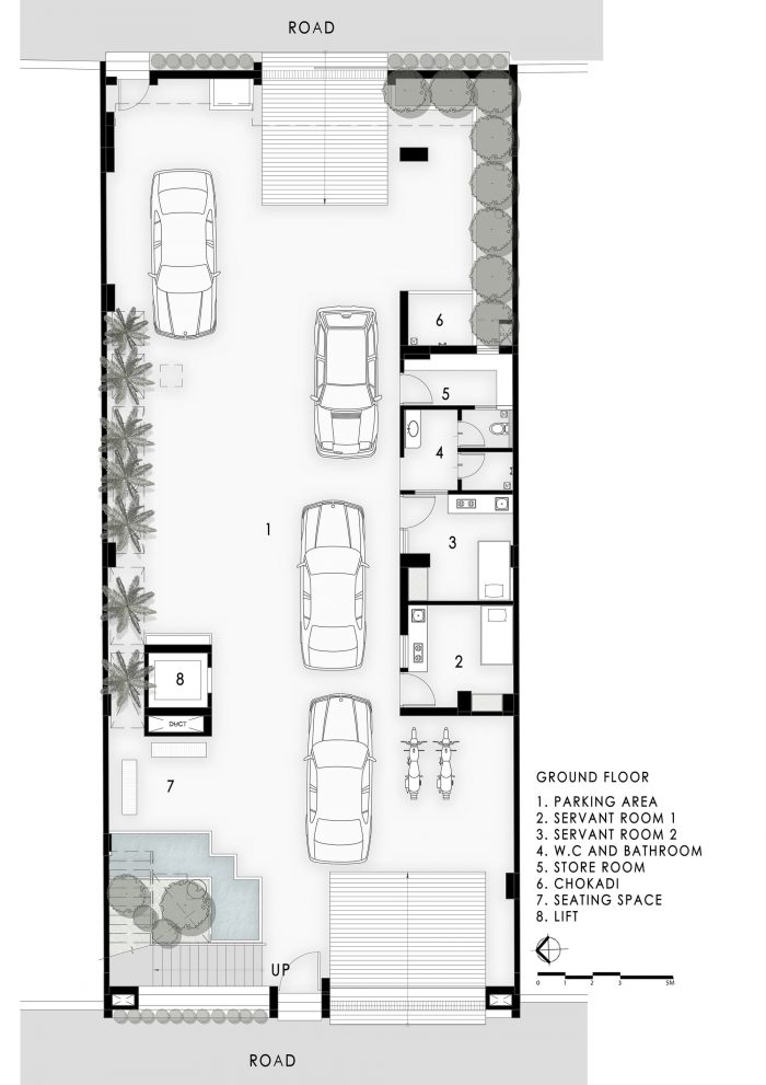 ફળીયા"中的呼吸屋位于古吉拉特邦的钻石中心苏拉特的一个住宅区内,占地300平方米。在现在被城市发展所吞噬的传统村落街道上,这个线性房屋的设计试图在用户的传统生活方式和他们的现代愿望之间创造一种平衡。房子的核心是一个穿插在这个线性空间中心的庭院,它为室内带来充足的光线。秋千和用餐平台允许在球场上进行自发的活动,给人一种平房内花园的感觉。庭院使北部保持开放,以获得全天的自然光,是房子的社交中心。