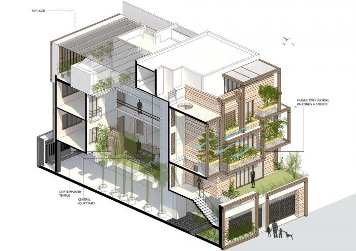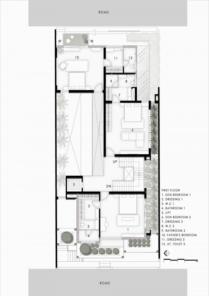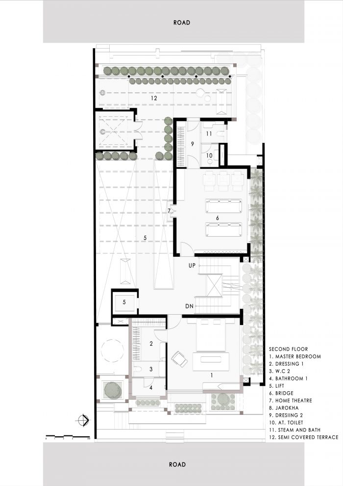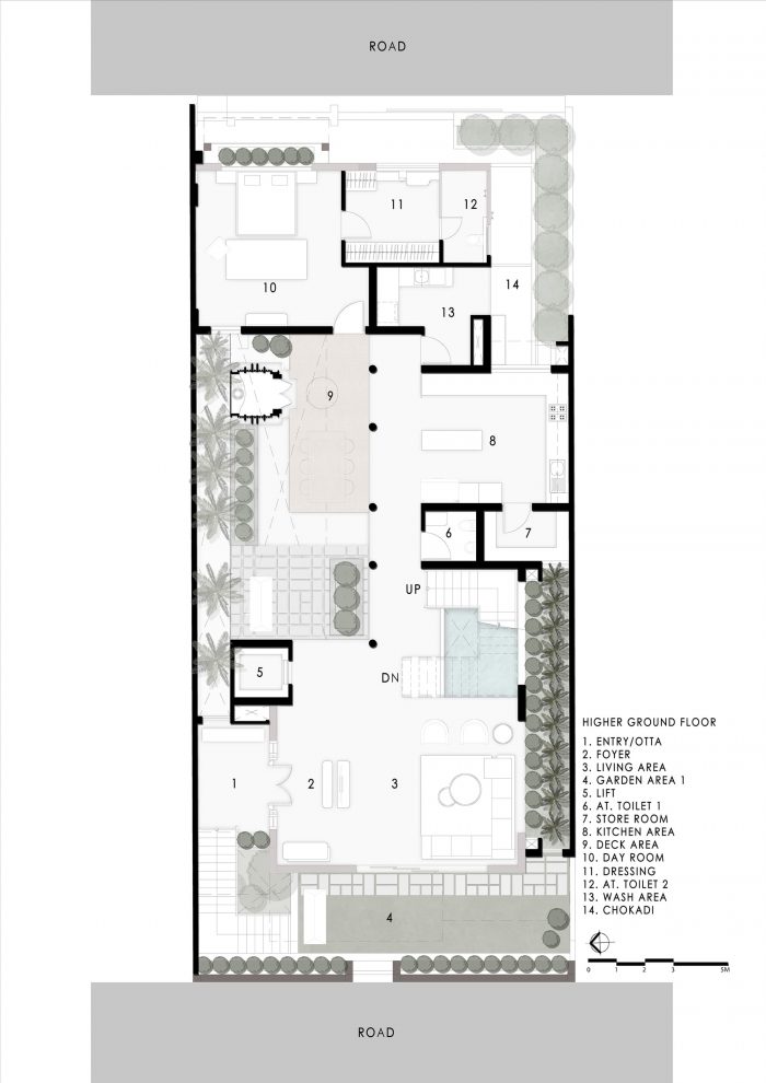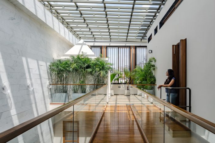 Light Play - The house brings an ample amount of light through the linear court positioned on the north side where it shares a common wall with the adjacent house. With the stack effect created due to the sectional play and cross ventilation a continuous draft of air is ensured in the house, for a humid climate is very important and hence creates a conducive indoor environment. Blending the built and the landscape, every space in the house is associated with the Greens and sunlight which is an integral part of the house. The house also has some unique features such as connecting bridges across the court.