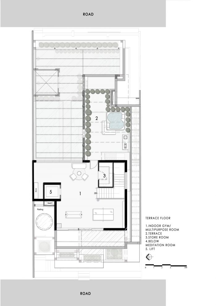 节奏--传统上被定义为一个没有屋顶的空间,完全或部分地被墙围起来,庭院提供了一个凉爽的、隐蔽的区域,可以在户外进行社交或放松,但在住宅内。奇拉坦家广泛的凉棚在分段式游戏的帮助下,确保了这种舒适感在各个层面的实现。热空气通过庭院上升,从安装在露台护栏上的窗户离开前提。这确保了舒适的生活温度和房屋各部分全天的日照。该空间叙述了客户对自然元素的喜爱,如水、自然光和绿色。通过使用开放式规划和将绿色小巷引入房屋内部,开放和封闭空间之间的界限逐渐消失。