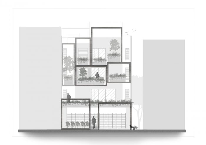 The Breathing House in a “ફળીયા” sits on a 300-square-meter plot within a residential neighborhood in Gujarat’s diamond hub, Surat. The design of this linear house in the traditional village street now engulfed by urban development is an attempt to create a balance between the traditional lifestyle of the user as well as their modern aspirations. The heart of the house is a court punctured in the center of this linear space which brings in ample light to the indoors. The Swing and the Dining platform allow spontaneous activities in the court and give a feel of the garden within the bungalow. The court keeps the North open for day-long natural light and is the social hub of the house.