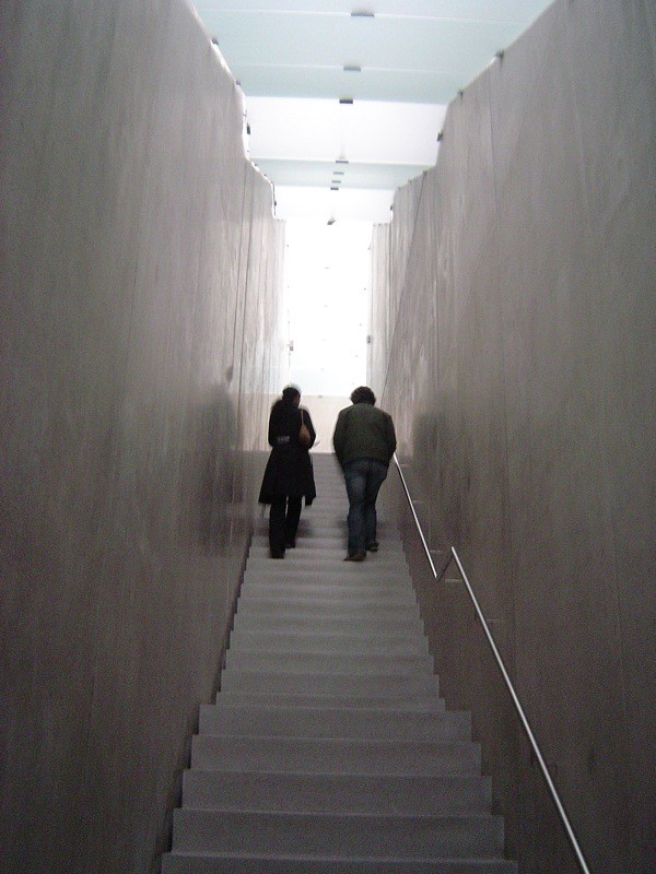 The interior of the museum complements the exterior simplicity and minimalist aesthetic. The gallery spaces are composed of materials that are minimal in design, but highly effectual in detail and atmospheric conditions. The walls and floor are made of polished concrete, and the ceiling, that filters the light from the plenum, is made of frosted glass. The basic materials of the interior give the gallery spaces a stark, cold feeling that works to accommodate the art working in the space. When the light enters through the plenum, the polished concrete seems to dematerialize and wash away allowing for the closed off galleries to become flooded with light.