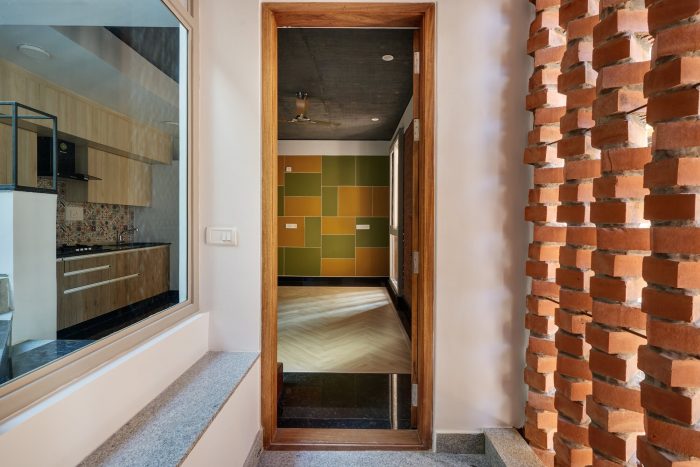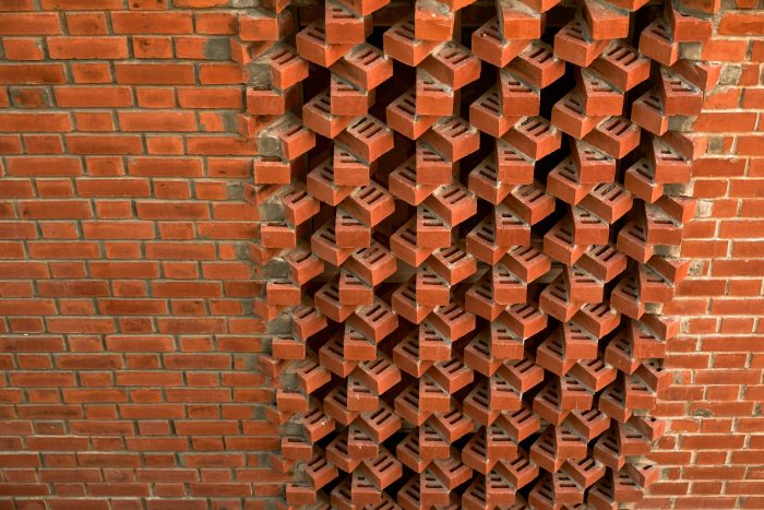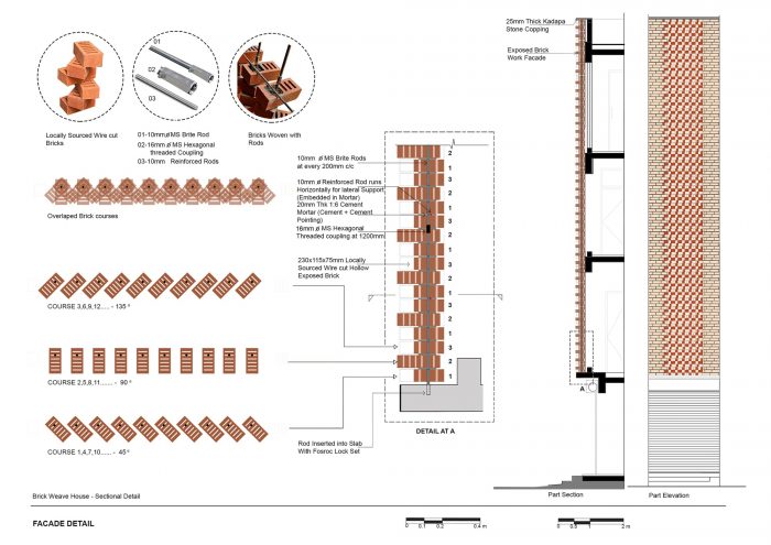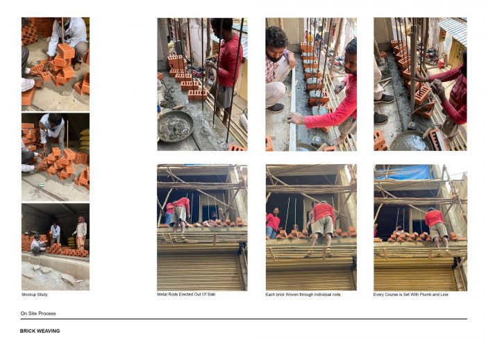 Concept. Cubbon Peth historically housed Bangalore’s oldest handloom silk weavers’ colony. In the post-industrial revolution, hand-crafted silk weaving art is lost over a period of time. Our beloved client hails from a family of weavers and has a childhood memory of the traditional weaving systems. With the intent of preserving this tale, the idea of traditional weaving translated into brick weaving, and thus, we created the Brick Weave House.