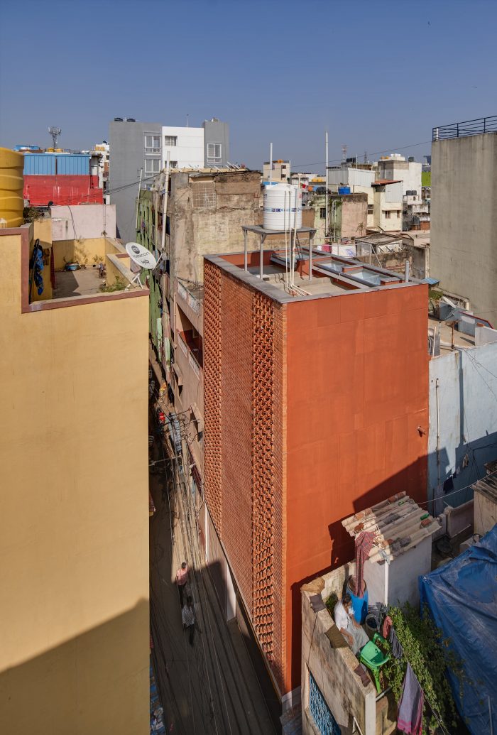 概述。砖瓦房是一个坐落在Cubbon pet的混合用途建筑中的住宅;印度班加罗尔最古老和最繁忙的地区之一。房子坐落在一个24英尺宽/16英尺深的地块上,与一个8英尺宽的紧邻,其南面是繁忙的通道。在邻近的排屋中,它是最独特的,被设计成有吸引力和功能性的砖织屏。