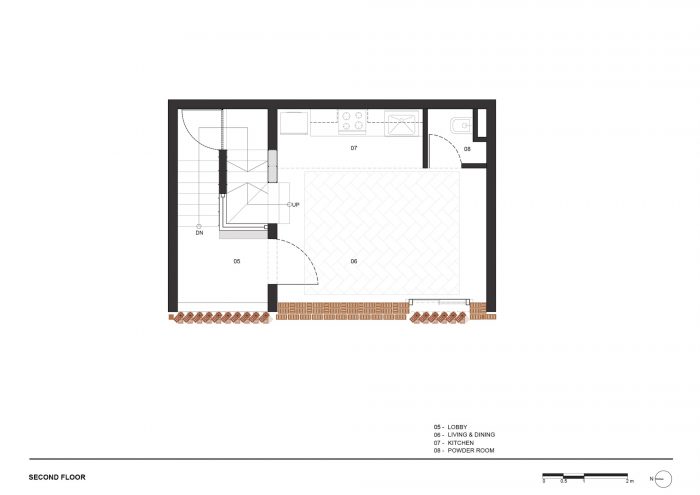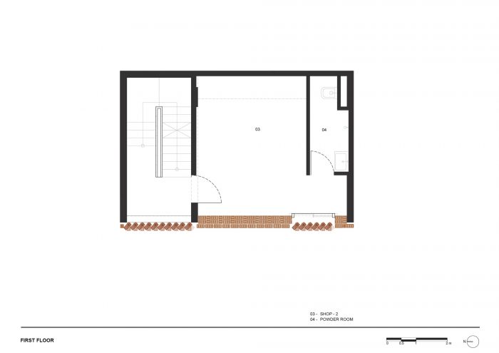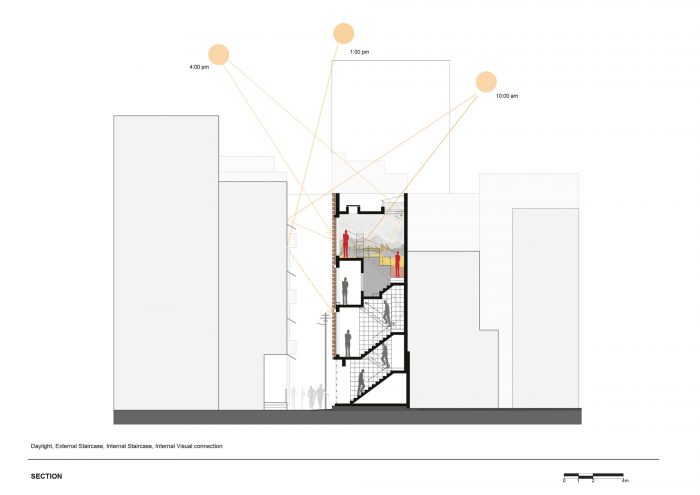 Brief. The challenge was to create a mixed-use typology in this tiny plot, with commercial space at the first two stories and a residential duplex over the same footprint for the bachelor client and his mother. So, House connects the two commercial stories via an external staircase, which then converts into an internal staircase for the residential duplex above.