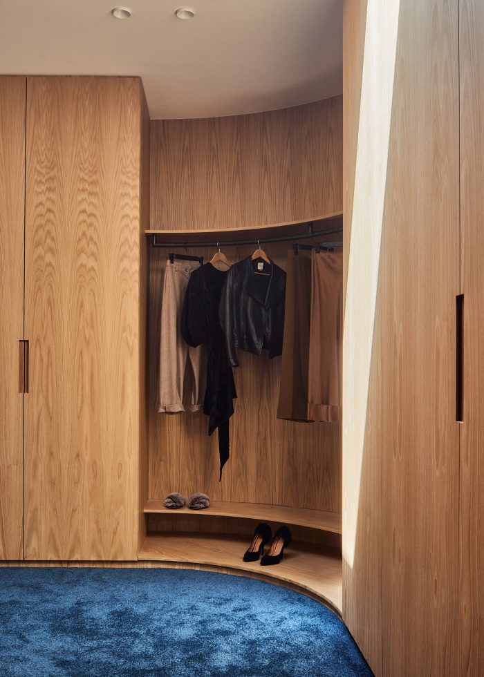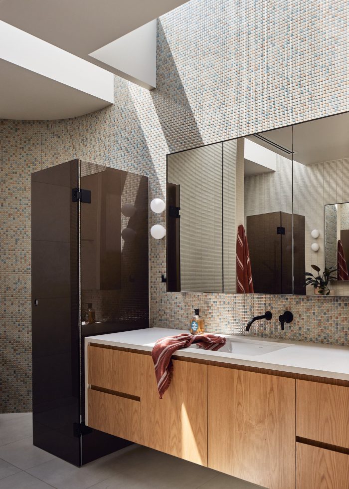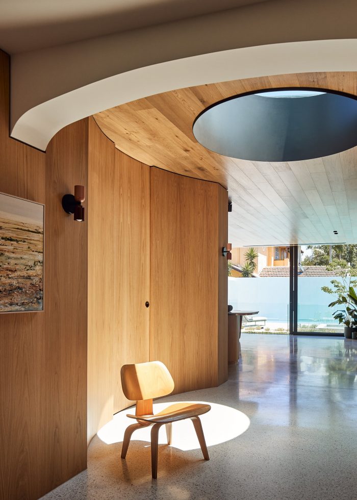 The prevailing aesthetic is a nuanced balance of old and new: white-on-white concrete flooring meets original terrazzo and bright blue plush carpet, timber lining envelops the interiors and burnt orange velvet couches nod to the home’s history. So, too, do the custom-bronze glass and flocked carpet in the sunken pit. The original glazed skylight has been scaled up and wrapped in a timber-lined ceiling to link with nature.