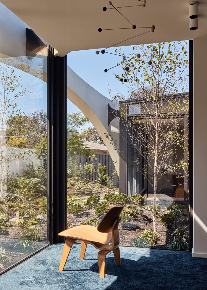 As a family home, the spreading out of the house and garden enhances the work-from-home potential, with the glazed corridor to the master retreat proving to be an excellent pacing area. The clients can both work from home uninterrupted while their children play in the garden or rumpus. On its generous suburban block, the new build sensitively integrates contemporary family living with an architectural relic of a celebrated era. The versatile design embodies biophilic principles, focusing on connection to landscape and flexible living, whilst also enhancing the existing home.