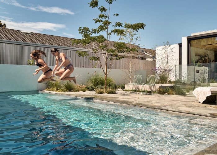 Skylights minimize the need for artificial lighting and are but one of the sustainable principles adopted throughout. Solar panels, hot water, and pool heating offset daily energy use, as well as extensive insulation, high-performance double glazing, and external blinds. Integrated floor heating within the exposed concrete floor acts as a heat bank during winter while the concrete maintains a cool finish in summer. Stormwater is collected to flush toilets and irrigate the landscape. Modified cladding materials achieve a concrete look and feel, without the expensive, non-environmentally friendly in-situ concrete.