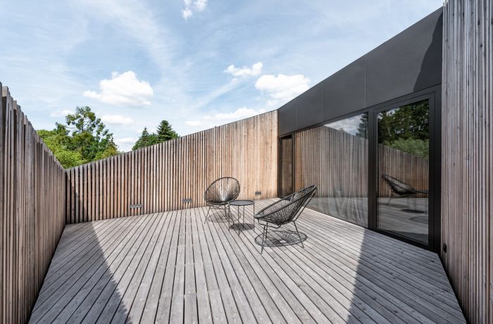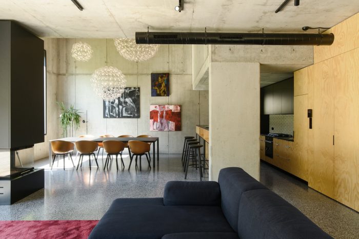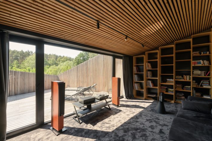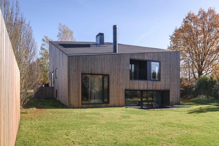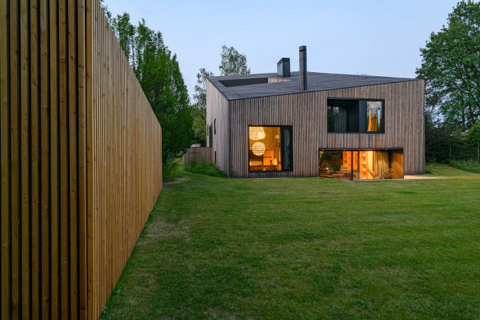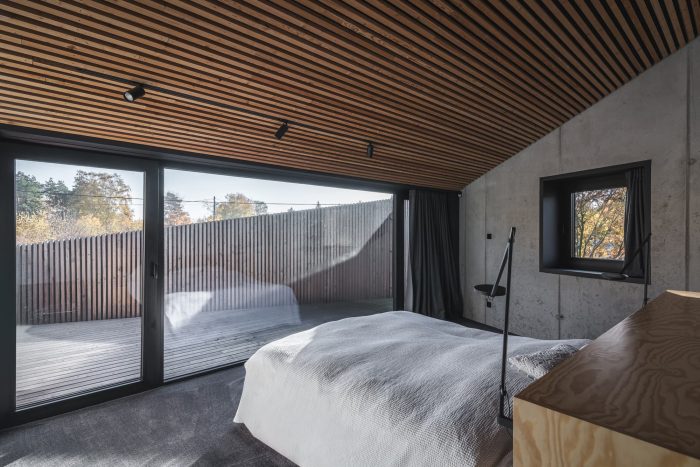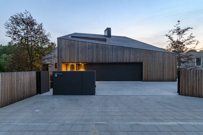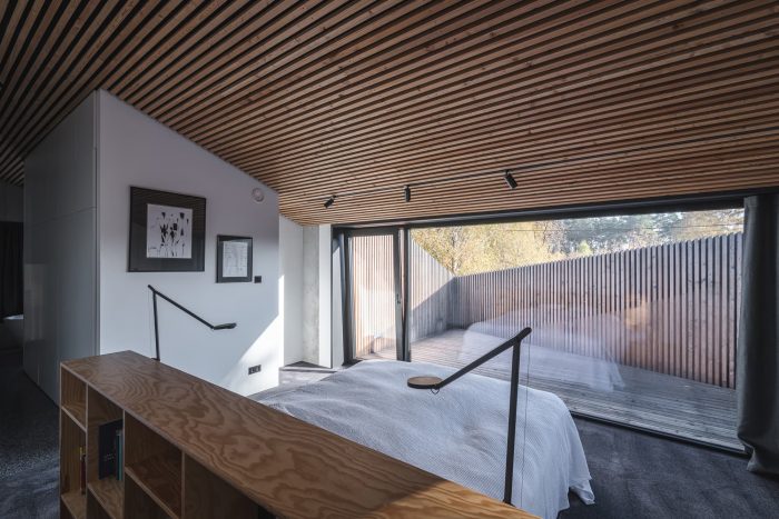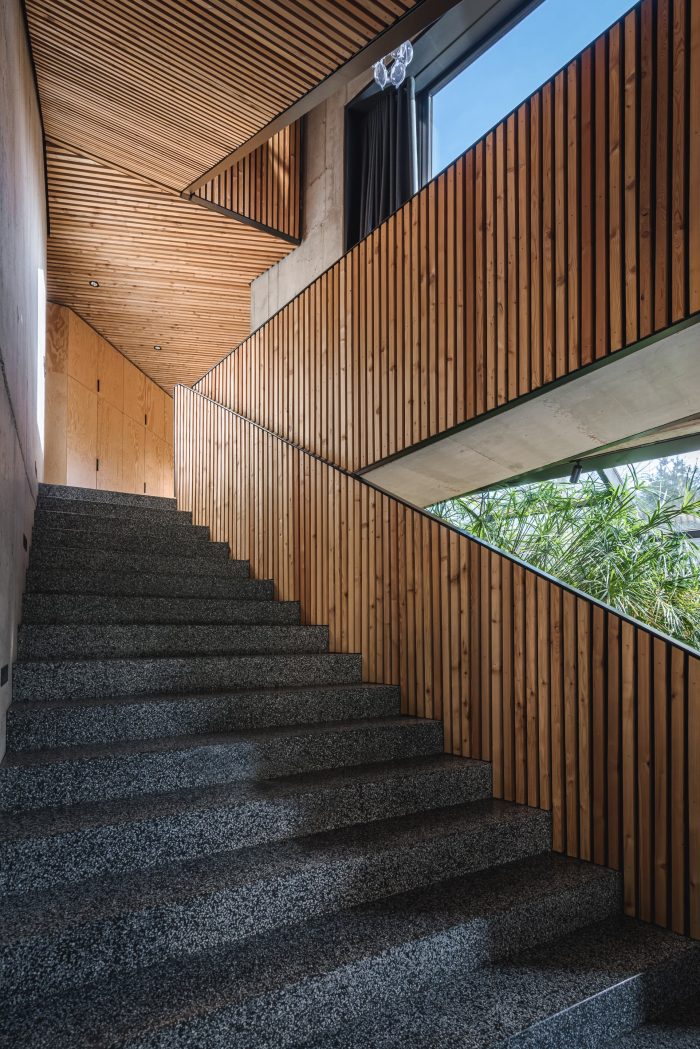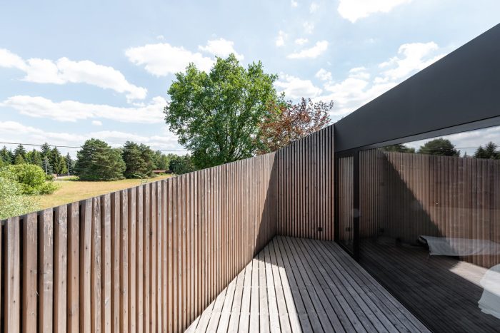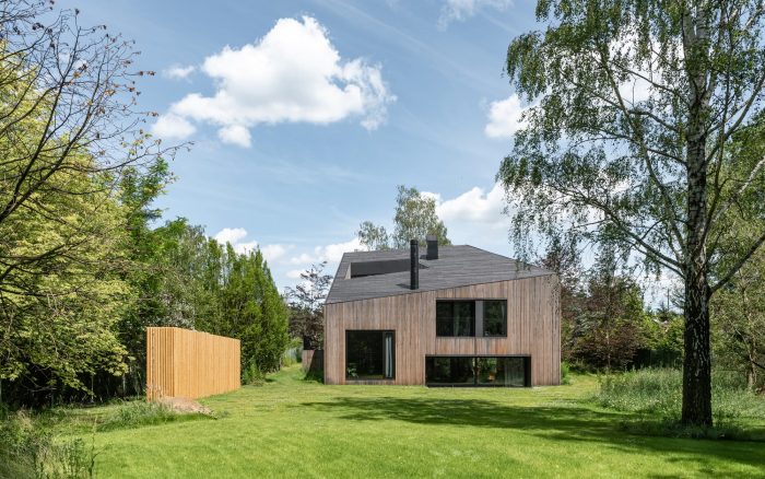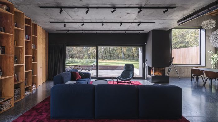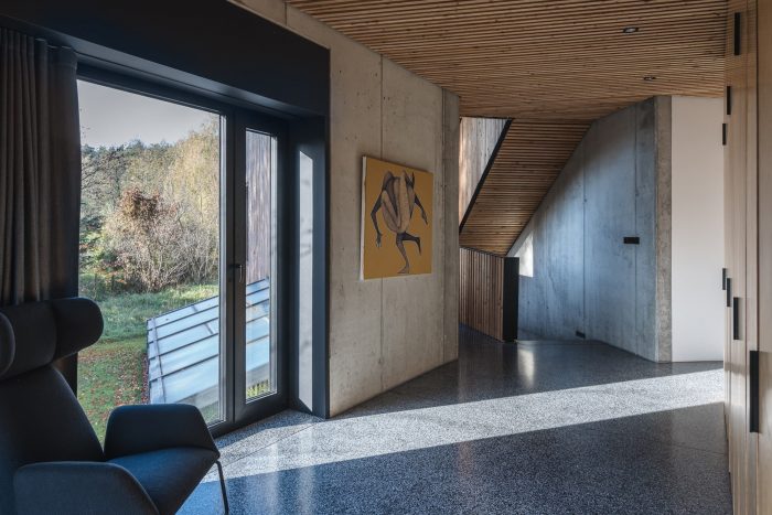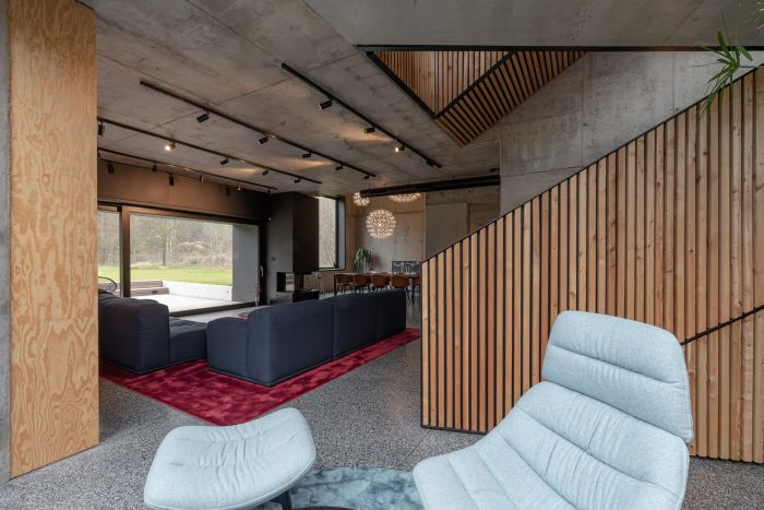 Interiors. The element that binds all the floors together is a spatially designed staircase. This staircase acts as a ventilation chimney in summer, forcing the natural movement of air, and in winter it draws the heat generated by the sun into the house, along with the adjacent conservatory. The facade and roofs of the house, as well as the fence, are finished with raw larch slats. In the interior, on the other hand, we left the structural structure concrete of the house unplastered. All furniture in the interior was designed from lacquered plywood, and the floors of the living and communication areas were made from terrazzo.