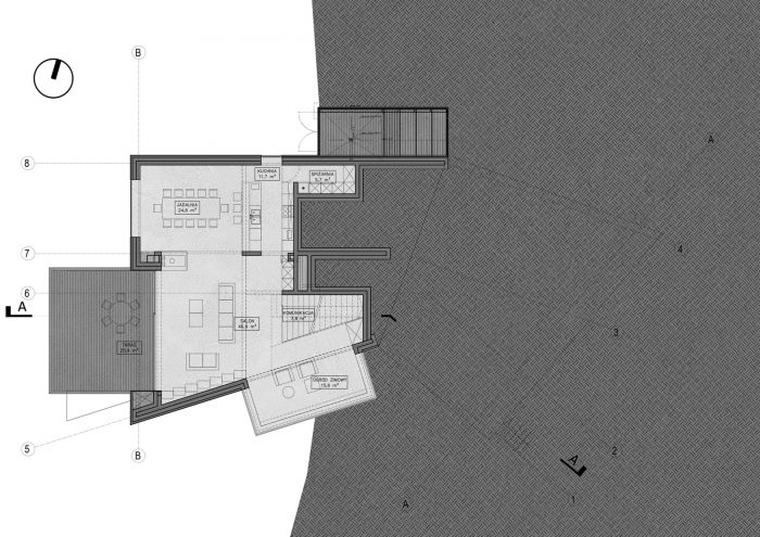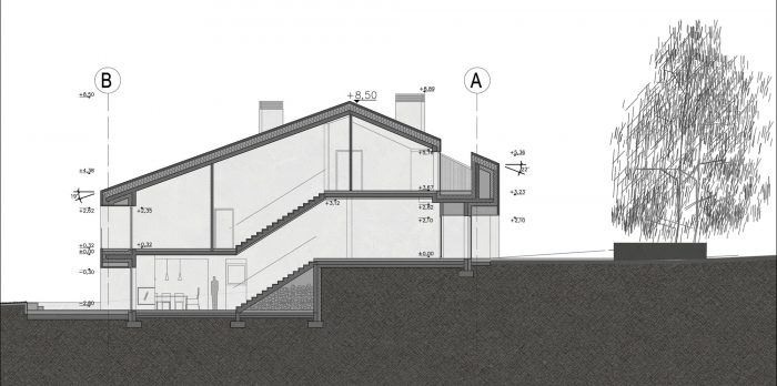 Function. The house stands on a rather problematic geotechnical terrain, so the entire structure was designed from reinforced concrete, which gave it adequate rigidity, was economically justified, and allowed us for more daring spatial solutions. Due to the fact that the plot descends along its entire length, the house has three floors. The entrance area, garage, children's rooms, and a small independent apartment are located on the middle floor. The living area with a kitchen and a conservatory on the lowest one. And the owners' sleeping area, with a study, is on the highest.