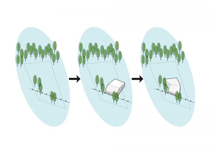 Idea. For these reasons, a block with a very classical shape was designed, with a roof with two slopes, with the eastern elevation based on the building line indicated by the office. In order to make such a standing and functionally fulfilling object fit into the plot, the body of the house was broken/bent in the place of the ridge.