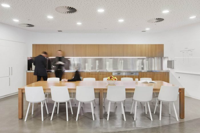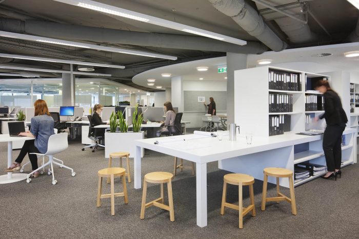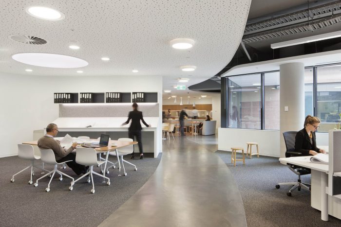 Woods Bagot’s design for Brookfield Multiplex’s new Melbourne office accommodation provides an innovative work typology that represents the Brookfield Multiplex brand which promotes knowledge sharing and increases staff interaction. Shifting to a fully-open workspace, the design encourages greater interaction and efficiency of work flow.