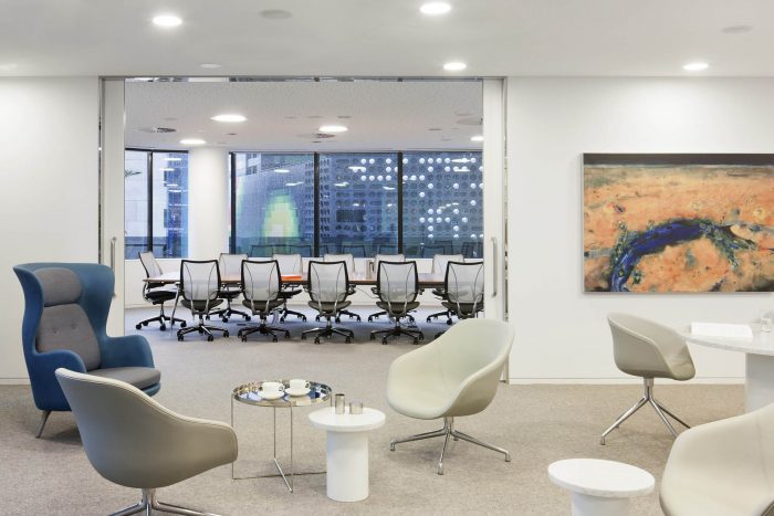Interiors are refined but futuristic, enabling a mix of work settings to suit a variety of activity-based tasks. Comprising a diversity of open-plan and enclosed collaborative meeting spaces, the design allows for greater interaction of staff across the business, allowing for an enhanced sense of community. To support the firm’s social culture, large, open breakout spaces encourage staff to meet in a relaxed setting.