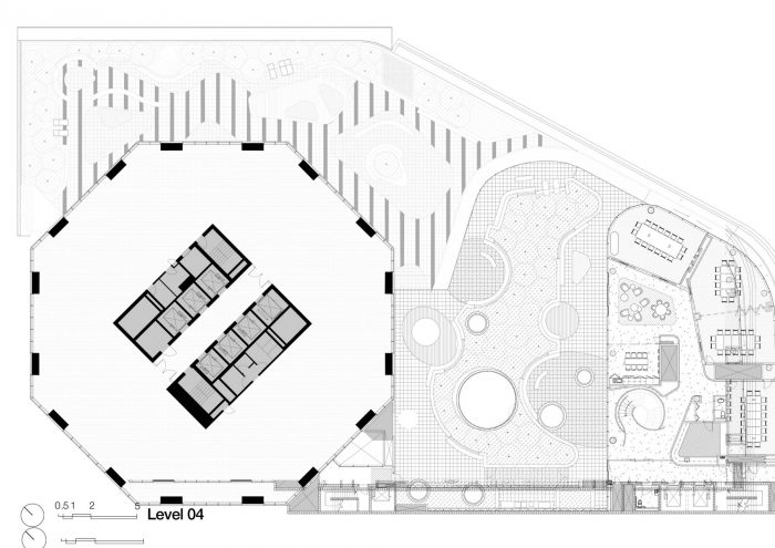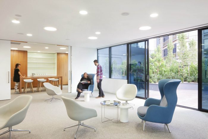 Drawing the outside in, light wells encourage natural light to penetrate the deep floor plates. Referencing the park, an internal garden atrium helps to connect the reception area with social breakout spaces. An external rooftop terrace can be accessed directly from the workspace floor and client meeting suite.