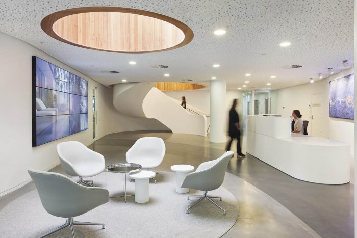 The design is based on four key principles: flow, longevity, showcase and parklife. These principles informed the design concept of a mobius strip, representing the infinite flow of connectivity between the two formal elements of the floorplate: the existing core and the newly introduced light atrium. Linking the two parts, the mobius reference is manifest in the curved lines throughout the space, including the walls, ceiling lining and floor.