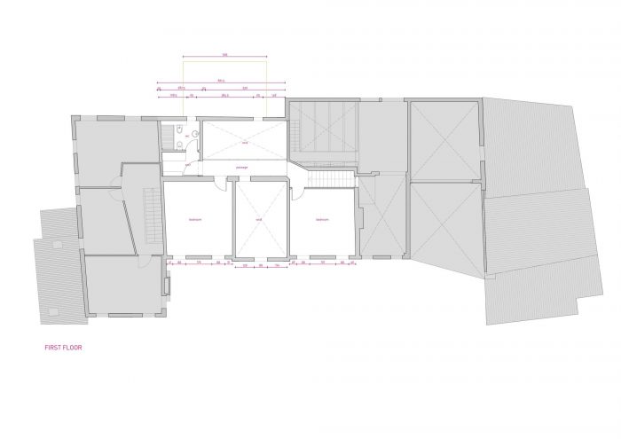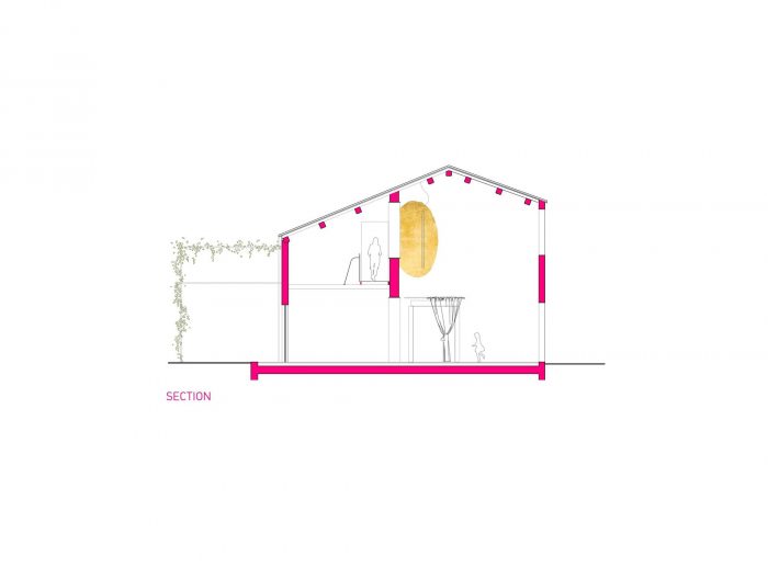 The project set up the two familiar unities, around the exterior side, a traditional space called “Aia”, that was well-known as a collective space for farmer's works and family playground at the same time. The two unities, both strongly featured in a brutalism approach, share this space, keeping, at the same time, the privacy they need.