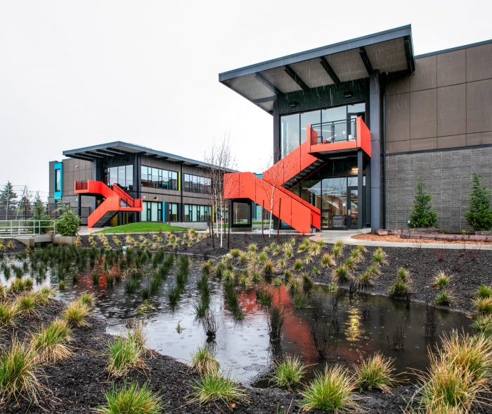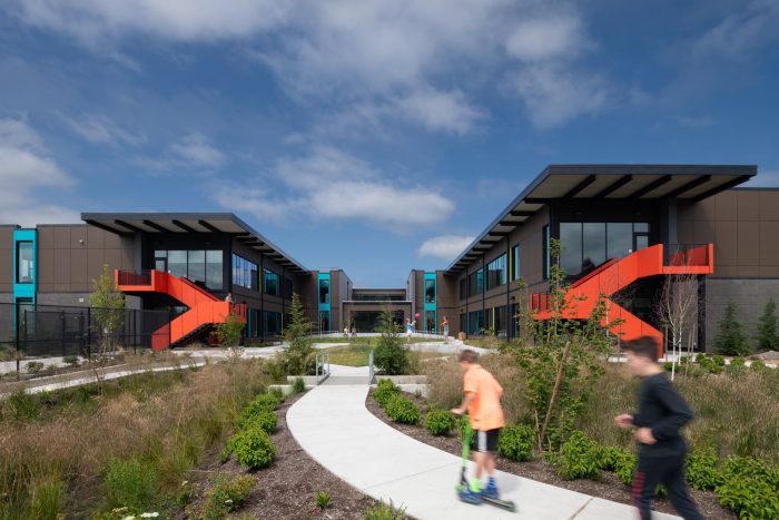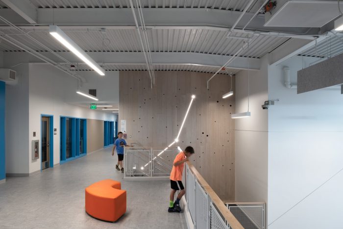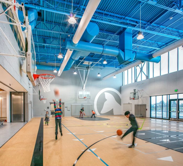 The school’s 10+ acre parcel sat adjacent to 8 additional acres containing public ballfields and a walking trail owned and operated by the Parks District. The popular use of these amenities informed the design team’s move to locate the gymnasium front and center. An expansive canopy that shelters outdoor activities at the front of the gym introduces a linear series of public spaces that open onto each other and offer visual transparency across the building and site.