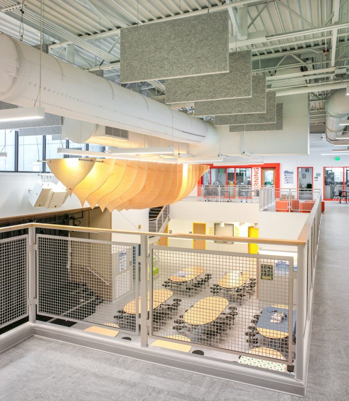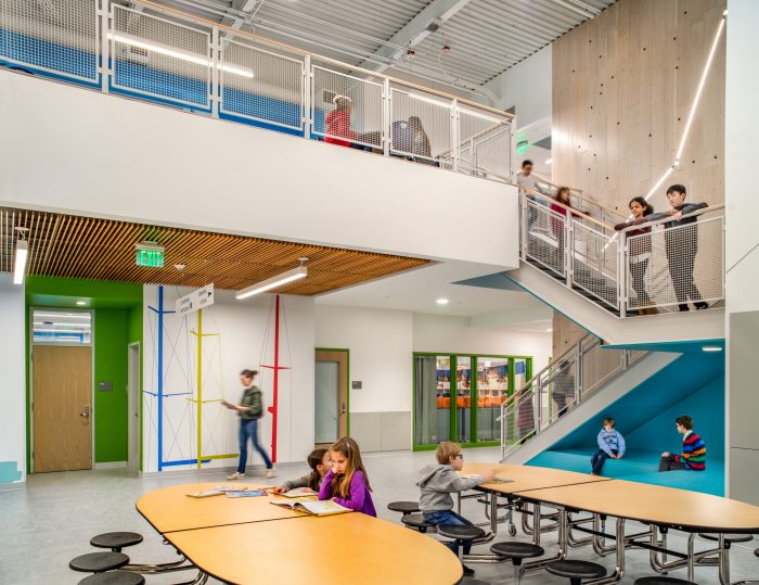 The design team looked for every opportunity to use “extra” space to spark a learning moment. Students are offered nooks, alcoves, and risers as places to stretch out, lay back, or curl up. The diverse array of spaces supports many supplemental programs and inspires project-based work, display of visual art, the opportunity for performance, and engagement with the neighborhood.