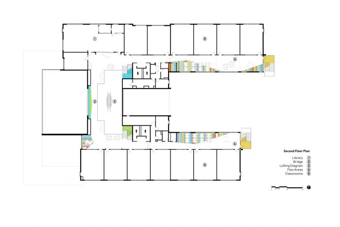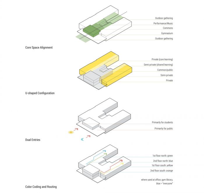 Based on a system of clear organizational hierarchy, the floor plan overlaps public/private and indoor/outdoor learning environments to achieve a sense of spaciousness within an efficient design. Dual-purpose function springs from a merger of circulation with program space that serves as a multi-functional zone. A compact, two-story floor plan minimizes “in-between” areas to enhance connectedness and intimacy among learning neighborhoods.