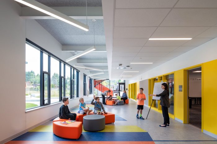 在布朗斯角小学的设计中,学区客户寻求一个具有未来思维的、多用途的设施,要求--除其他标准外--设计要加强学生的个性化学习;方便员工之间的专业合作;鼓励各组织兼容使用,努力做到:1.补充学习,加强学校内部的社会联系;2.促进课余时间对建筑的公共利用。