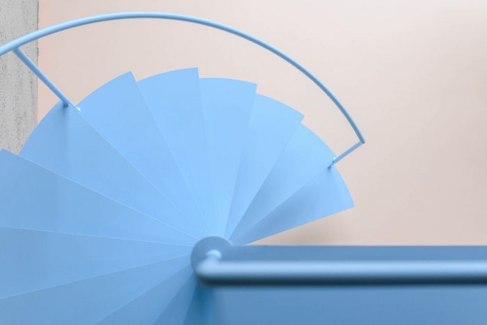 The kitchen island is designed as a sculpture in the room when out of use, but highly functional when in full chef-mode. Remodeling the apartment at 45m above ground level meant all bespoke furniture needed to fit the internal elevator defining the maximum size of the island and forced us to weld and paint the steel blue spiral stair and passerelle on site, a job well executed by Stielatelier. The new staircase was moved to the far corner of the room allowing for a better flow and reconnection with the views from the top windows when ascending to the upper floor.