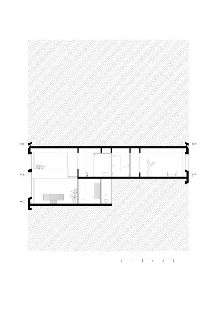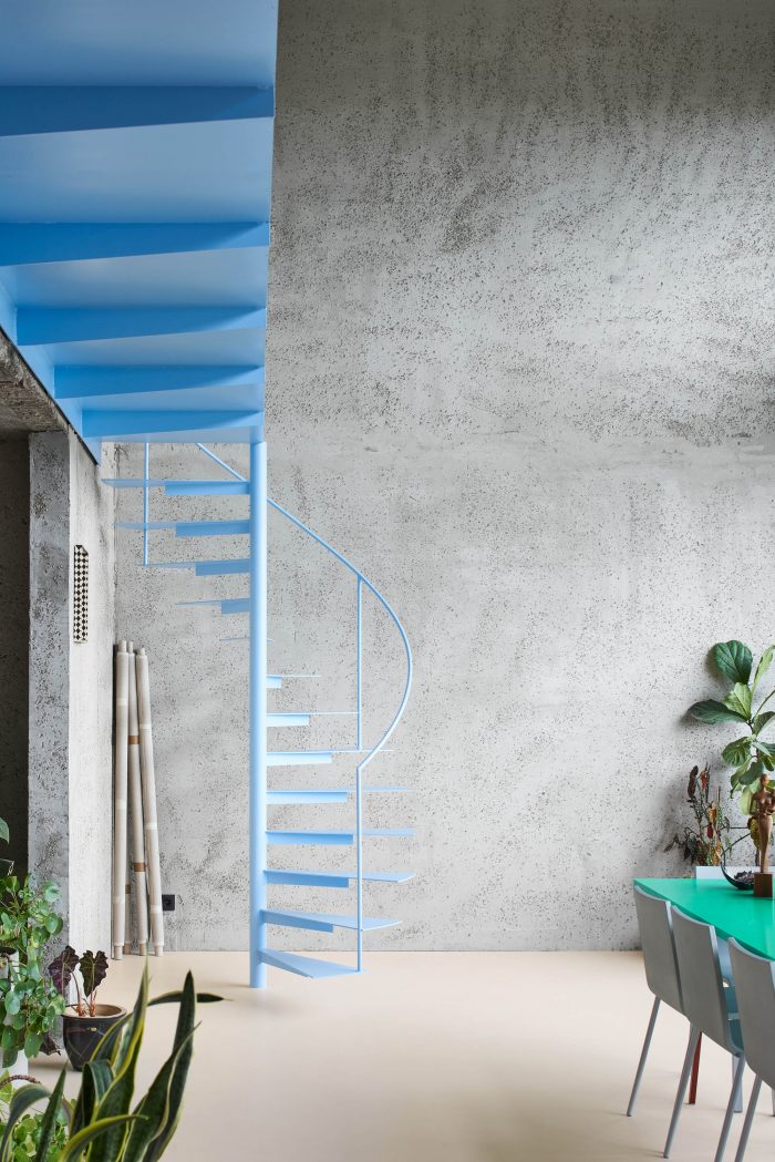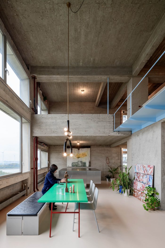 The Riverside Tower is a high-rise development from the early 70s designed by Leon Stynen & Paul De Meyer, beautifully situated in the bend of the river Scheldt, a stone’s throw from the city center of Antwerp. It’s here, on the 13th floor, that founding partner Bram Van Cauter of Studio Okami Architects renovated a duplex to match the brutalist tower which he calls his home.