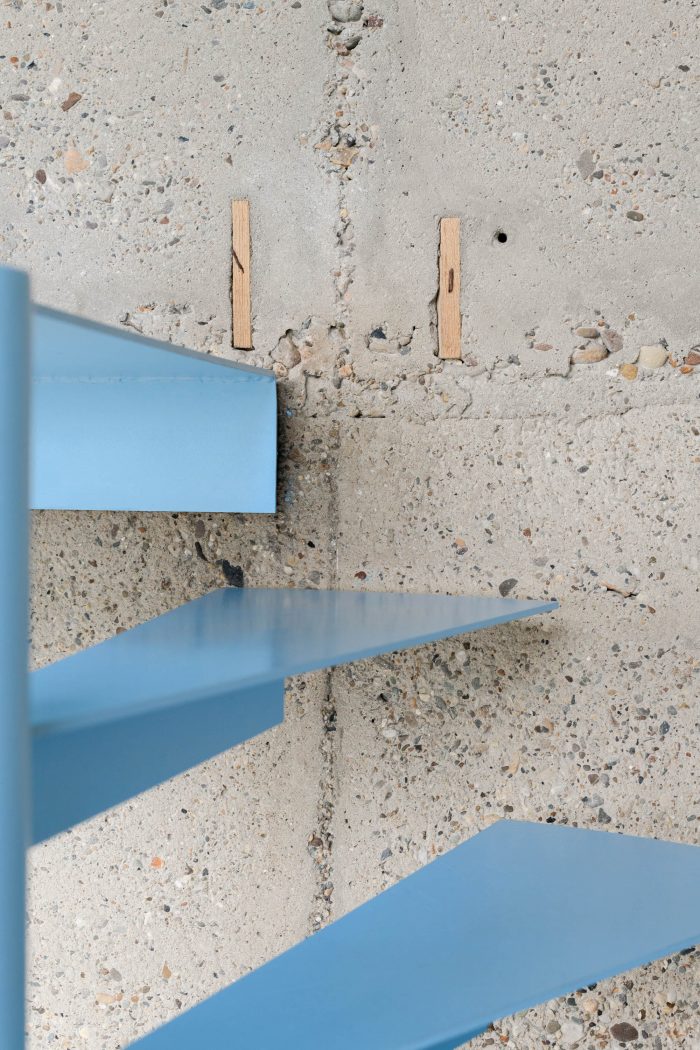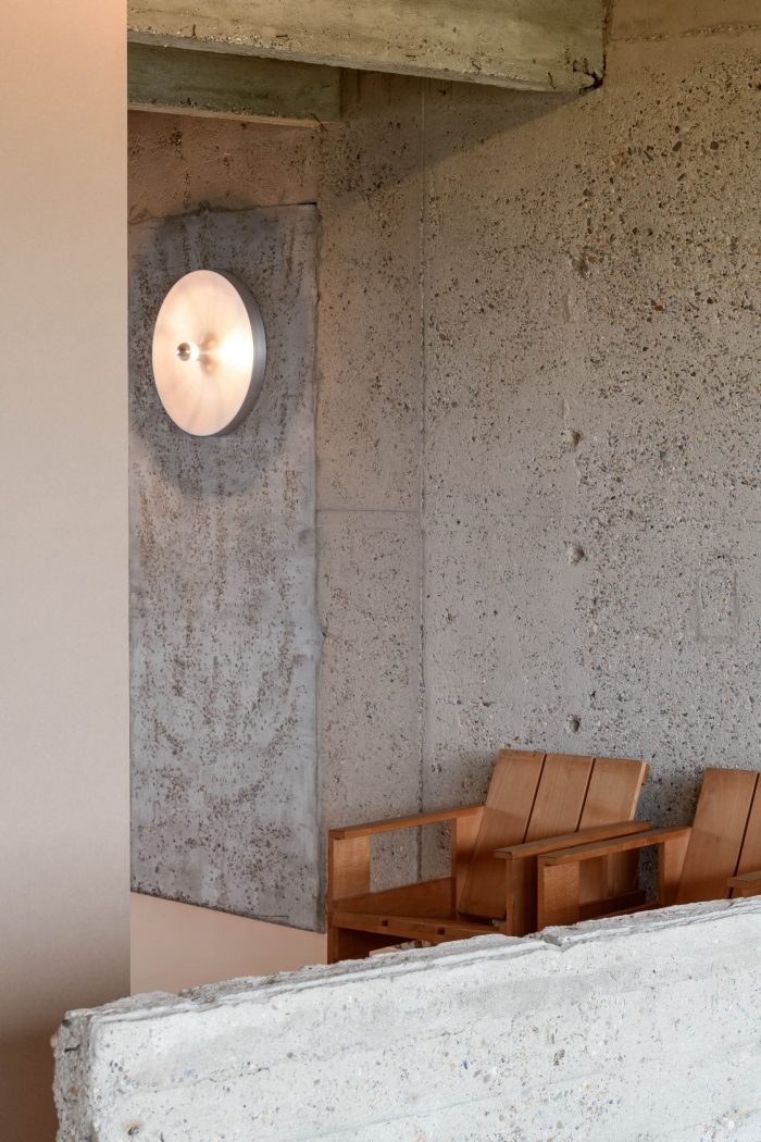 The rough concrete is balanced out with a peach-colored liquid floor trough-out. The concrete walls form the ideal backdrop for Doris’s art collection, existing holes and plugs define the position of every artwork. The few brick walls were cemented and given an authentic look by throwing little stones into the settling cement. Upon entering the apartment you are greeted by double-height pivoting windows overlooking the harbor and neighboring forest. The space is conceived as an entertainment area with kitchen appliances tucked away in a Donald Judd-inspired wall unit.