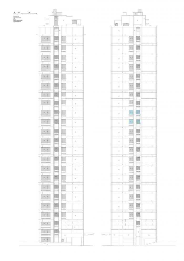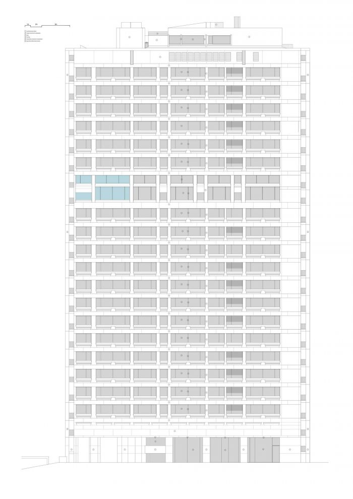 当为Okami工作室在10楼购买一个新的办公空间时,业主想出售他在大楼里的剩余房产;这个独特的复式楼就是其中之一。河滨大厦共有20层,公寓面积在90、150和200平方米之间。唯一的例外是13楼,那里的复式公寓形成了一个独特的布局,有一条内部走廊连接两个双电梯井。
