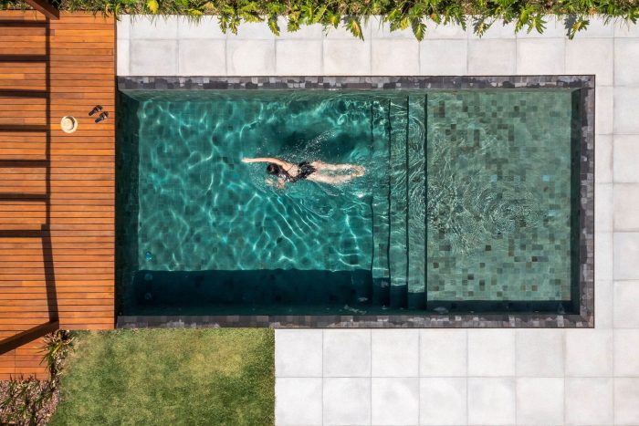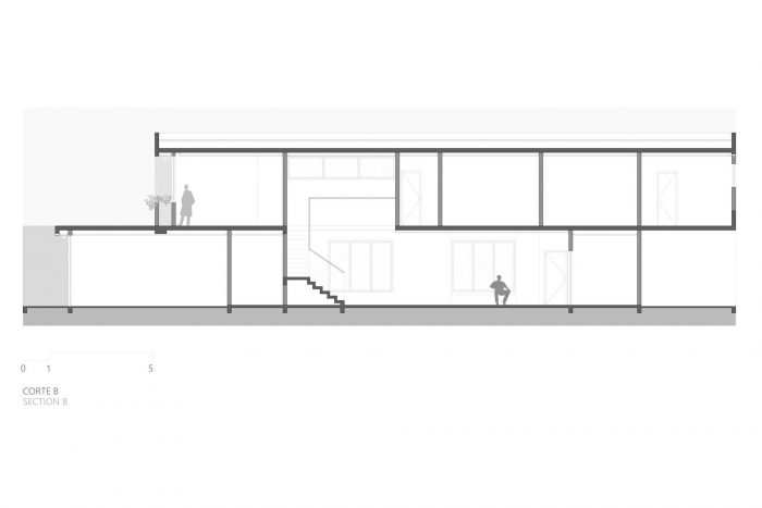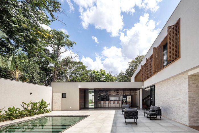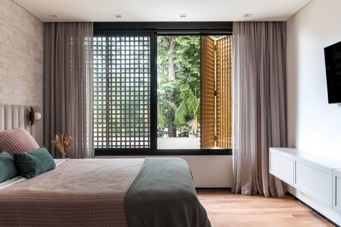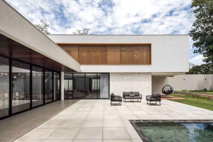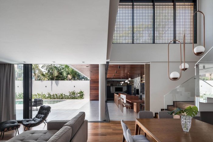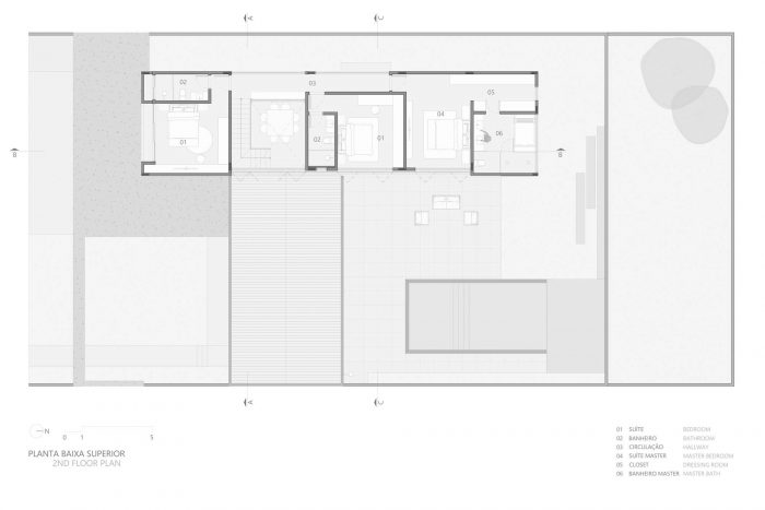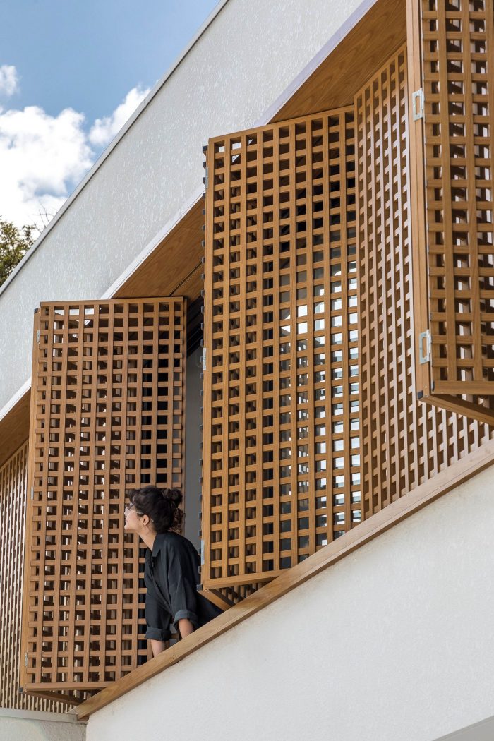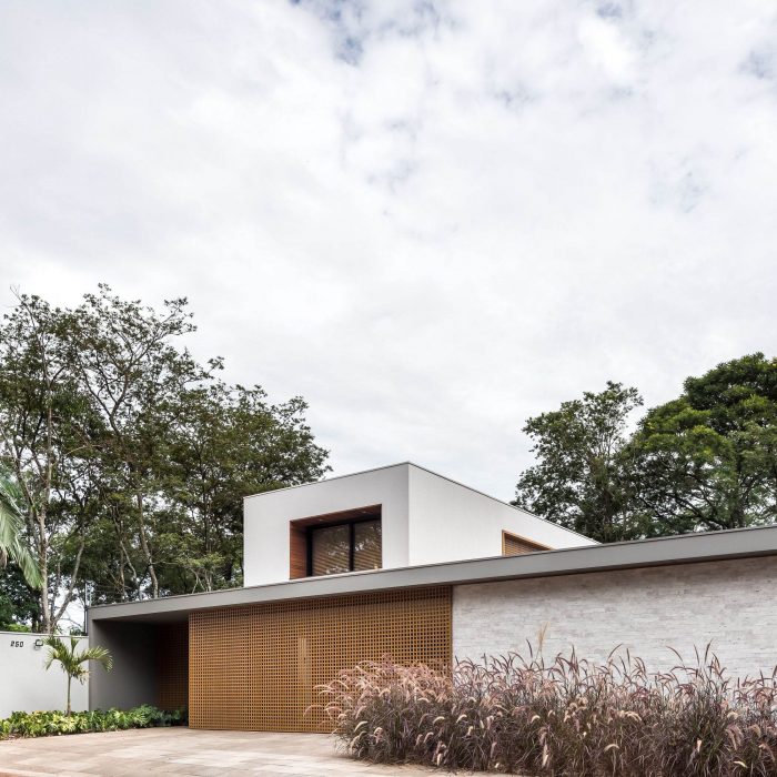 The second-floor refuges the intimate area of the residence, consisting of three large bedrooms. This floor is organized in a pure volume marked by a muxarabi shrimp holder, which gives privacy while allowing the light and ventilation to permeate its voids. Such elements give the walls and floor unique designs formed by light and shadow every morning.