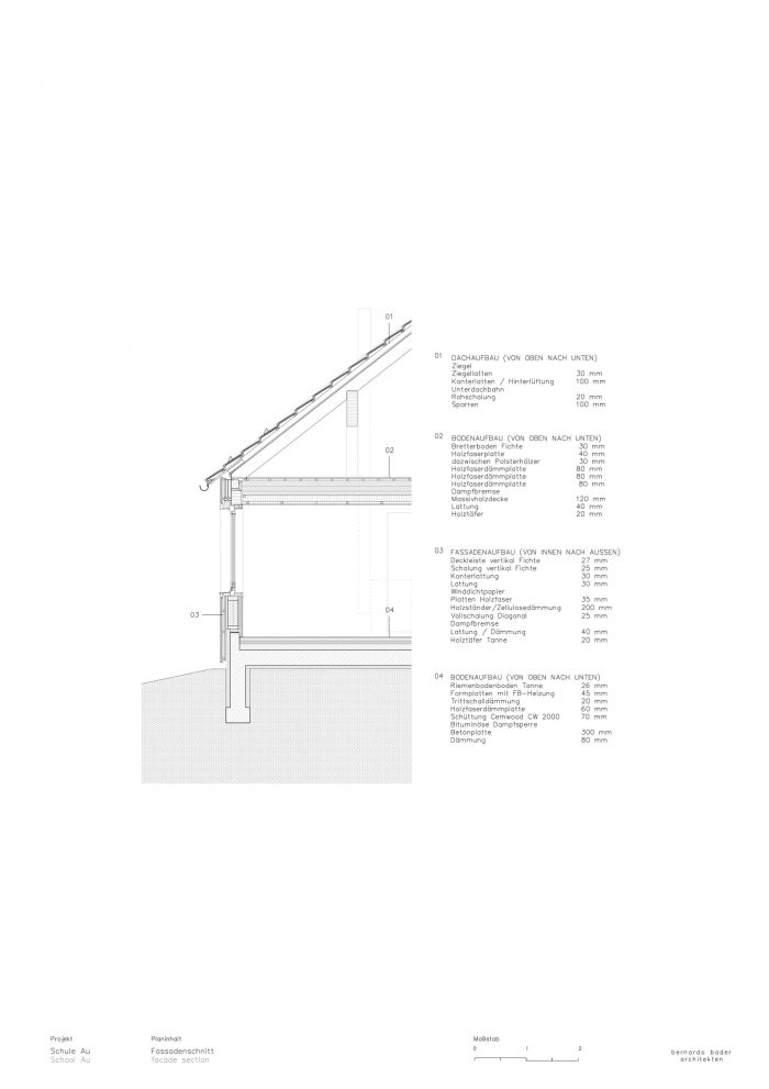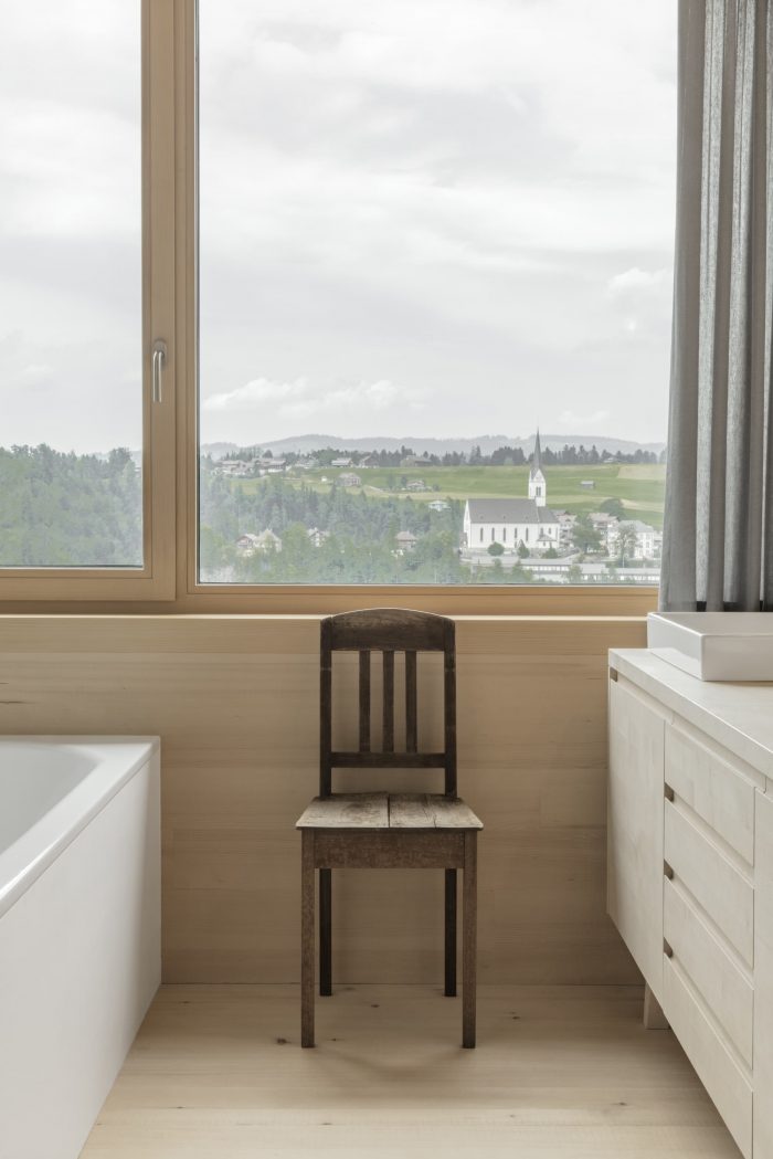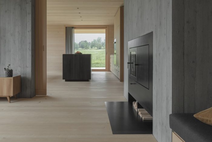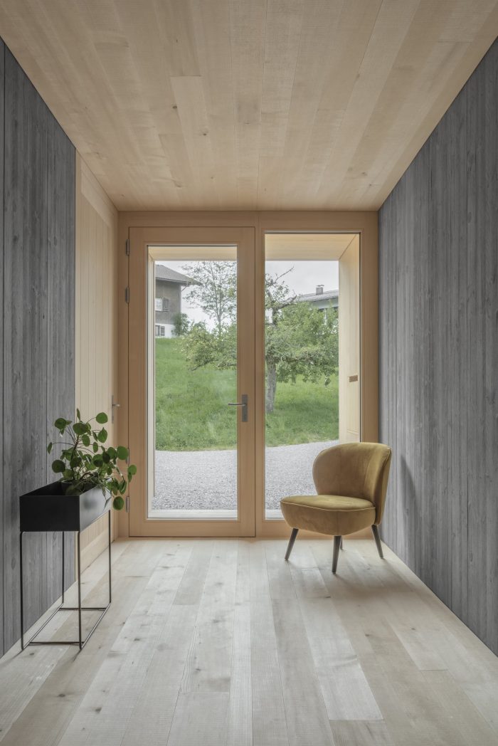 The house is accessed via a small entrance porch at the front. From there, a long and extra-wide residential corridor leads deep into the building, a classic middle corridor type. The floor plan is organized as an enfilade of chambers, which are finally broken up into a spacious room zone in the form of a kitchen and living room. The walls of the wet rooms, the pantry, and the oven wall are solidly cast in fine plank formwork of concrete. These form the core of the house and provide the necessary storage mass in functionally correct places. All floors and ceilings of the house as well as the other walls are paneled in finely-grained spruce. The reduced, but very careful craftsmanship of the rooms, with their dignified furnishings, expresses the high level of the living culture of the "Wälderhaus".