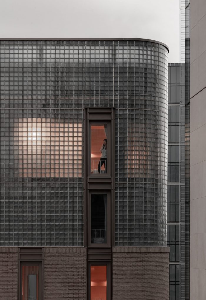 建筑物的冠部被设计成与底部同样的比例,并完全由玻璃砖包覆。我们指定了一种带翅膀的玻璃砖(翅膀用于隐藏灌浆缝),它具有热效率,漂亮的发光效果,并且像下面的砖一样,具有质地、重力和持久性。当从内部照明时,房间里微妙的、弥漫性的光亮柔和地使皇冠变得生动。体积给人以坚实和短暂的感觉,居民对内部空间的激活产生了自然的动感光芒。