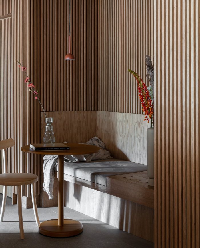 The principle organizing element of these areas is the parabolic arch. Legible from the street through expansive glazing, it also supports and defines the mezzanine within to the double height space at grade while consolidating the load of the front half of the building above. The structural expressionism is softened with an integrated timber balustrade and fluted paneling, clay plaster finishes, dress curtains, and soft furnishings. The floors and skirtings of fixed joinery are clad in brick congruent to the building’s facade.