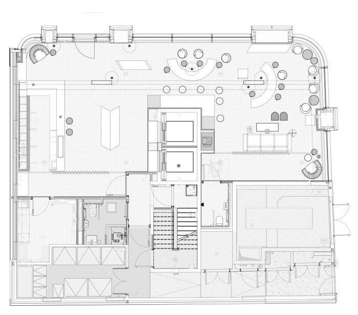 这些区域的主要组织元素是抛物线拱门。通过广阔的玻璃窗,从街道上可以看到,它也支持和定义了夹层内的双高空间,同时巩固了上面建筑前半部分的负荷。结构上的表现主义被一个综合的木制栏杆和凹槽镶板、粘土灰泥饰面、礼服窗帘和软家具所软化。地板和固定的细木家具的裙边用与建筑外墙一致的砖块包覆。