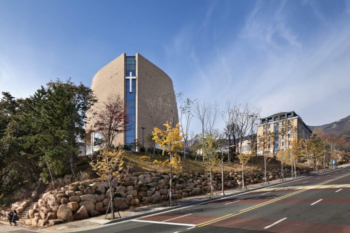 当我们在充满声音的校园里感受到一片寂静,或在明亮的空间里感受到黑暗时,我们的感官就会打开。在这个空间时间里,一种无声的力量向我们强烈地示意。釜山外国语大学教堂的设计意图是创造一个面向整个校园的剪影,这代表了学校的意识形态。