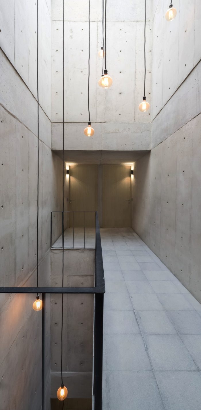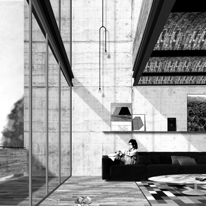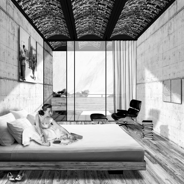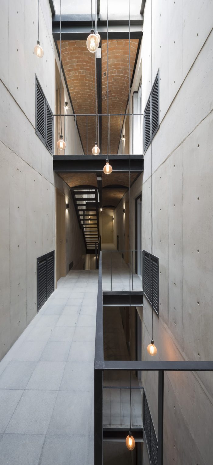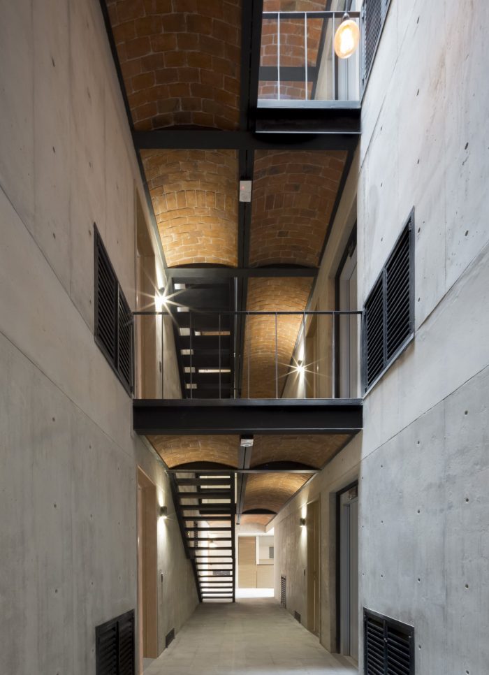 该项目在空间和结构之间有一个非常清晰的整合。所有的材料都以一种明显的方式来强调它们的可塑性特征。可居住单元的功能方案允许有一个清晰的建筑系统方案,其中包括:一个具有双重高度的中央循环和通往建筑中心的光线入口,这个入口有金属结构和砖拱顶;在循环周围是通道和核心服务,有厨房、浴室和盥洗室,承重墙是明显的混凝土和用于安装的固体混凝土板;最后,朝向前后立面的房间有双重高度,房间和餐厅有明显的混凝土负载墙和砖拱顶。
