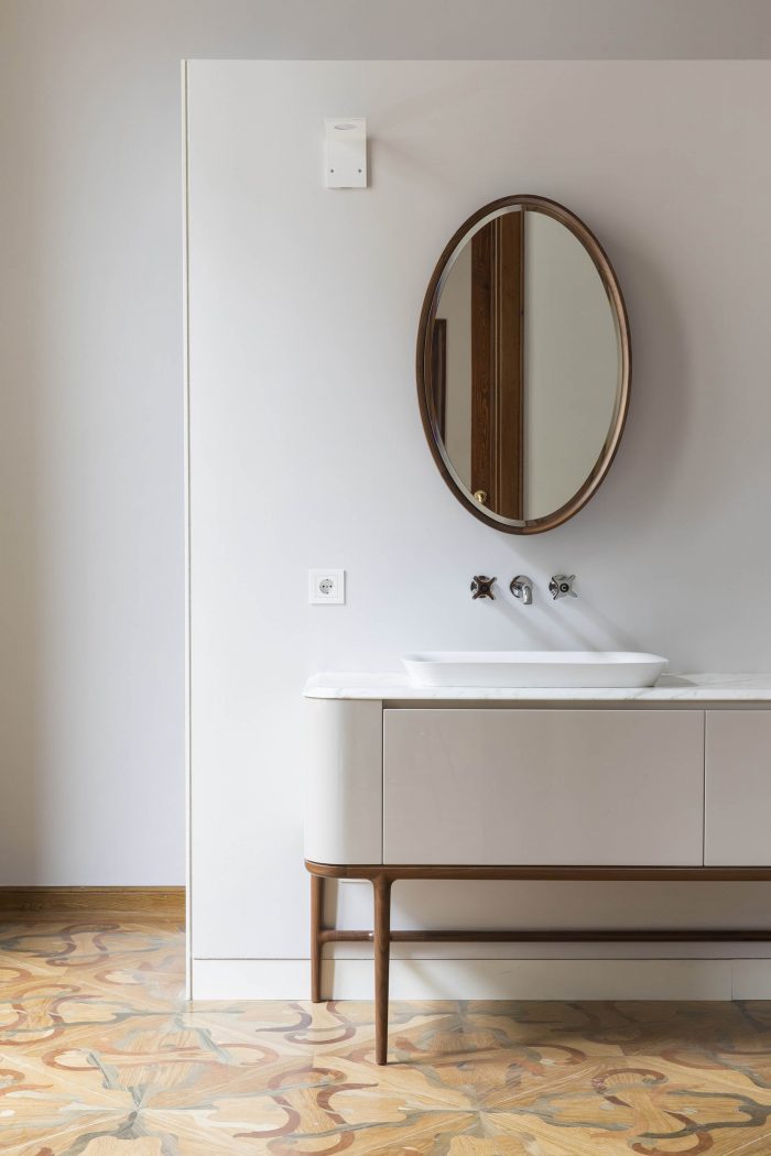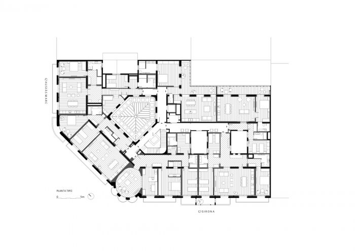 - Floor Plan: The goal was to create a clear separation between the old and the new. In the area of the building facing the façade, the elements that give a singular value to the space were recovered. For the interior, the chose was to incorporate oak wood where there was no Nolla flooring and apply white as the only color.