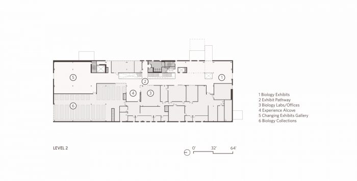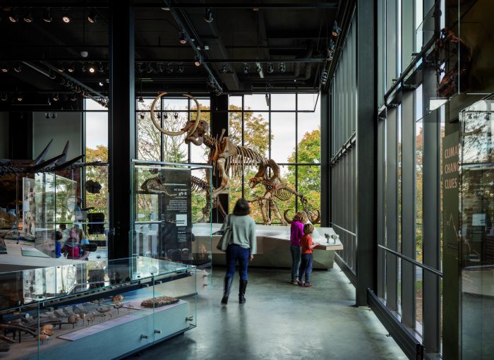 Large areas of glazing maximize transparency and expose the interior experience to the street to connect the Burke to the campus, landscape and city. The design further breaks down traditional museum barriers between public and “back-of-house” spaces, integrating collections and research labs with traditional galleries and enabling visitors and the surrounding community to engage with the process of scientific discovery in a true working museum. A 24-foot-by-20-foot pivoting window wall continues this emphasis on transparency to literally open the Burke to the nature of a new outdoor courtyard.