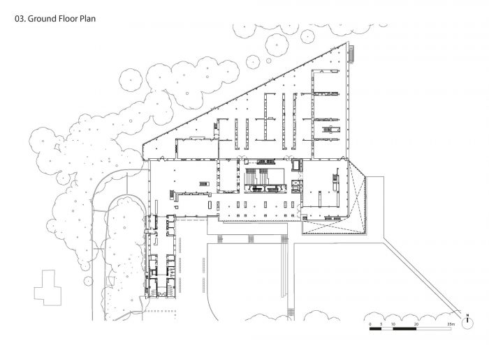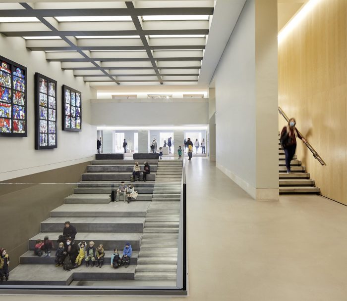 The Design. A discrete entrance has been added to the east of the retained existing entrance accessed from an adjoining paved piazza that creates an enhanced natural setting where visitors can also relax or picnic or spill out from the café at its southeast corner. Adjoining the entrance sequence, a new orientation volume connects the museum levels up to the mezzanine galleries and down by a stepped seating arrangement to the newly opened-up garden-level floor below. The latter now accommodates an exhibition and events gallery connected to a viewable art storage space, workshops, the rejuvenated café, and parkland beyond.