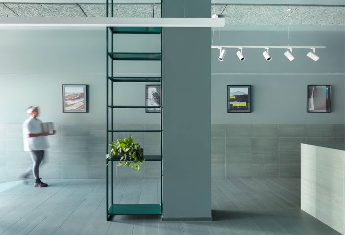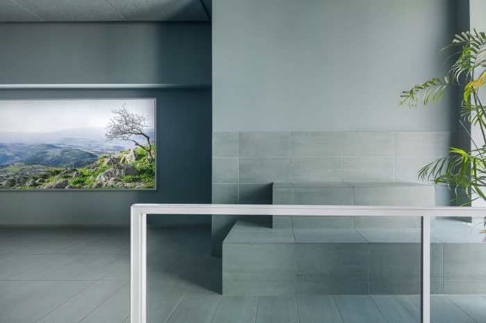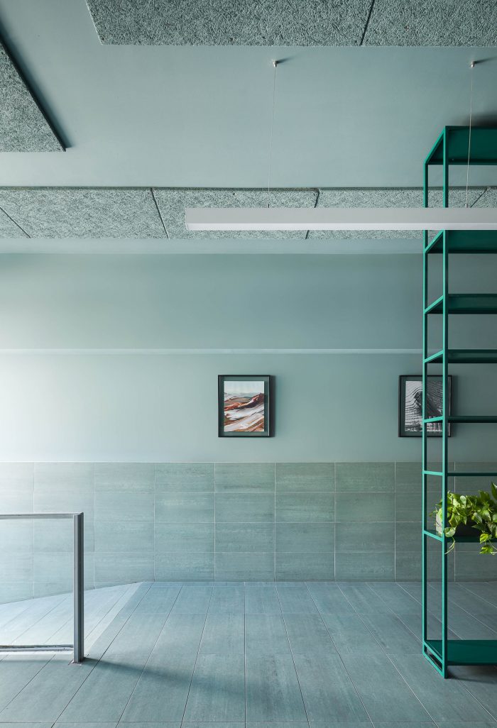 The green-teal shaded tiles used are full-bodied rectified ceramic tiles. The marble-like texture is created by the material itself, rather than being applied on like most common ceramic tiles. This means that each tile is different and has a natural appearance. These highly durable tiles have a smooth, matt finish and they are very pleasant to touch. So one can sit, lean, and walk on.