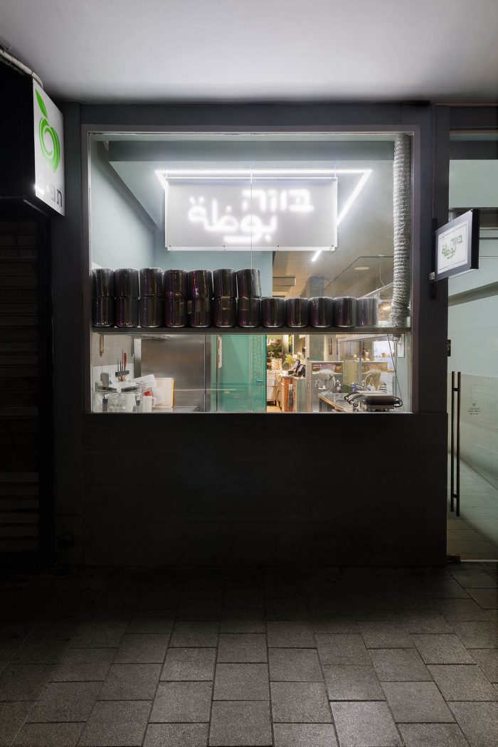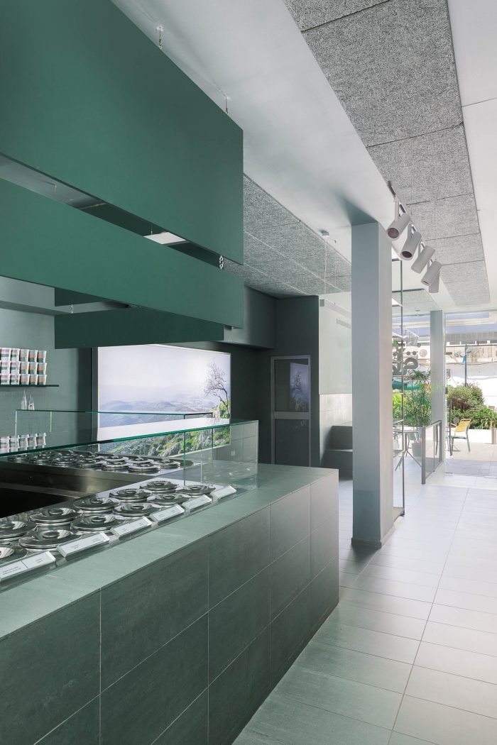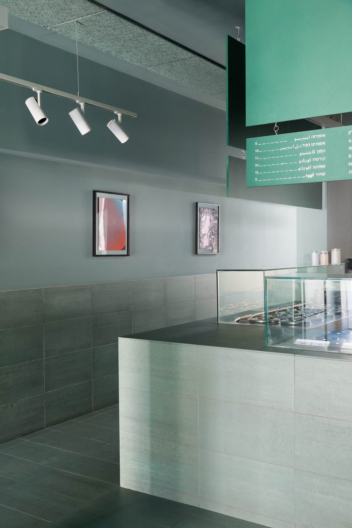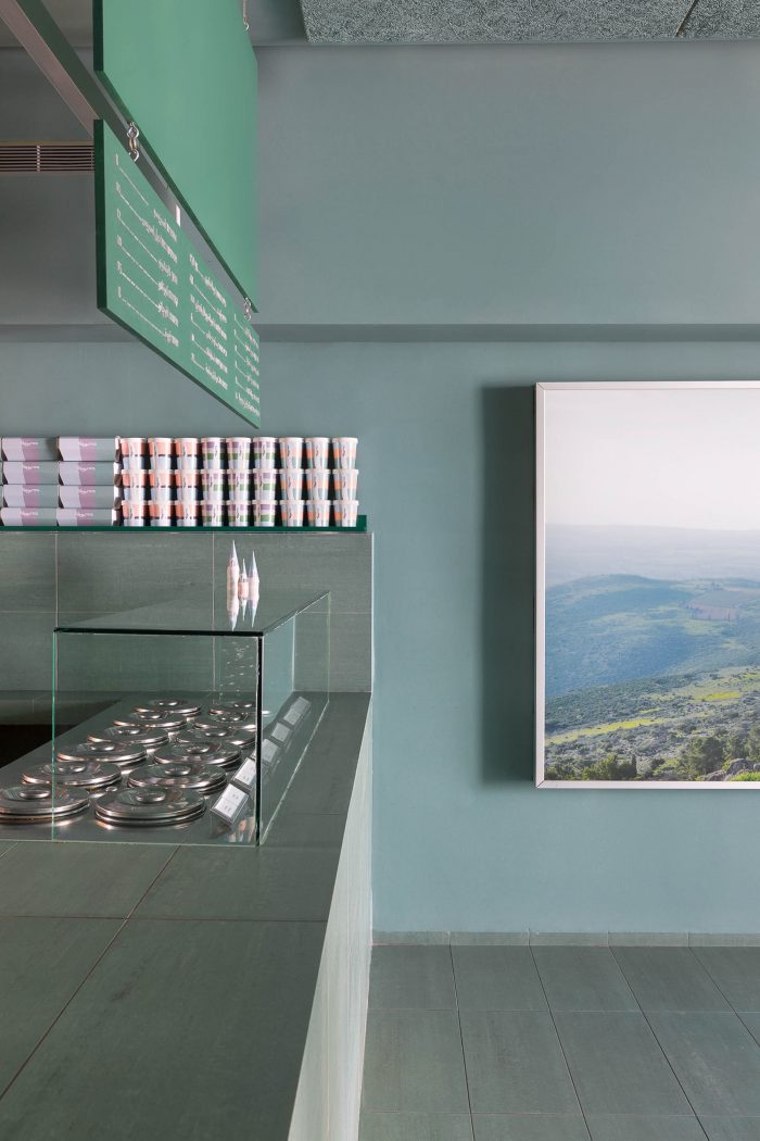 This particular shade of green references the green scenery from which Buza comes. That same natural Galilee landscape is also displayed on a large 3-meter long light-box. The color of the space was also meant to complement the newly designed ice cream cups and packages. On the long wall of the shop, a series of five abstract posters are exhibited. They were created as ice cream-inspired art pieces by Evian-Saggi Studio, the graphic designer who did the re-branding of the packaging.
