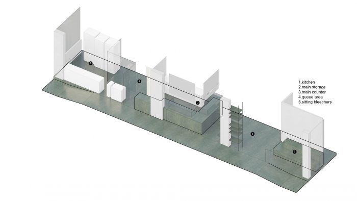 The principal idea of the design was to create a continuum of surfaces. The counters, walls, bleachers, and floors are all made of planes that combine into solid shapes in the space. All these surfaces are covered with the same tiles; a single material with a strong impact that is the main protagonist of the space.