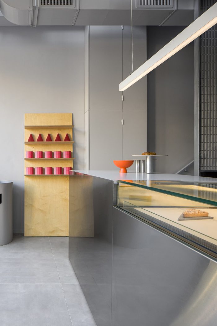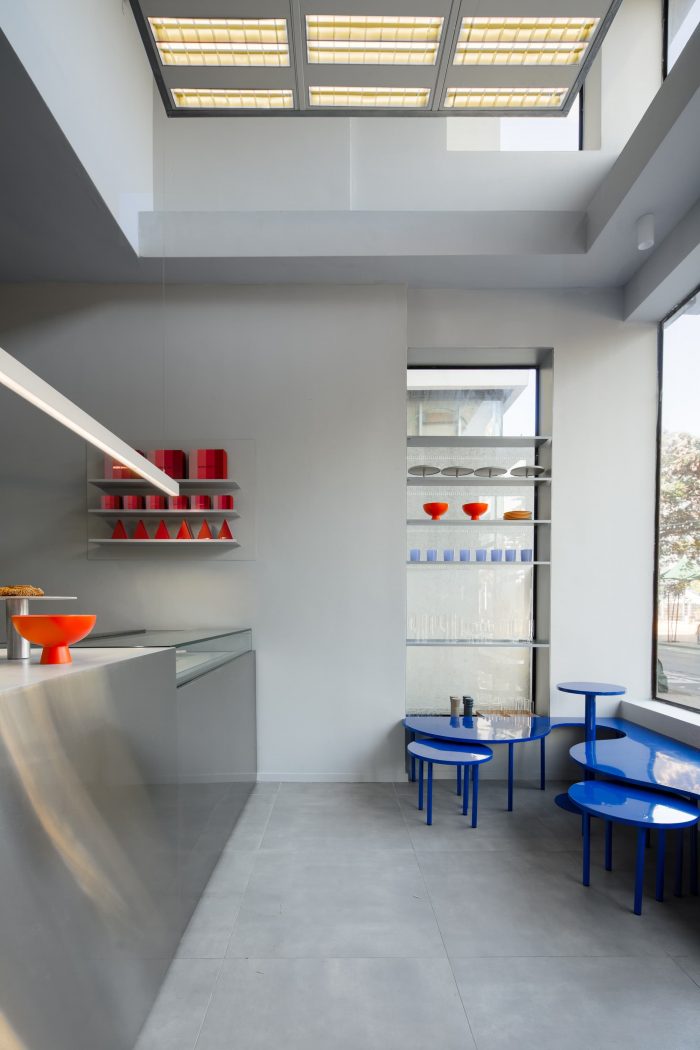 The interior of Alon's store offers a unique experience with its minimalist appearance and basic colors, creating a contrast with the street's familiar character. The studio's design and material choices aimed to highlight the patisserie's displays rather than compete with them using: Neutral gray colors, basic geometry, and clean, minimalist lines. Moreover, the studio created a distinctive seating system that defies the space's minimalist nature. The oval geometry, bright blue color, and iconic formality of the seating system make it Visually appealing for pastry lovers and easily recognizable from the street.