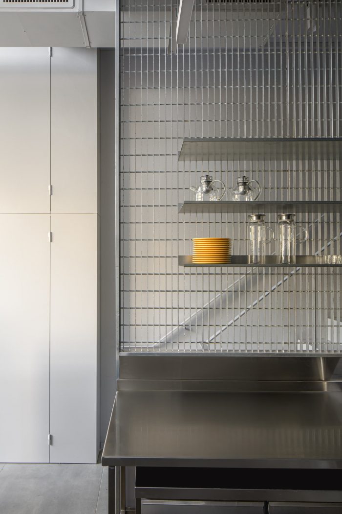 The venue is split into two levels, with the entrance floor featuring the main kitchen and a display counter as the primary point of interaction between the staff and customers. Additionally, customers can enjoy a cozy seating area where they can purchase and appreciate the designs of serving utensils created by both local and international designers. The seating arrangement includes stool benches and small tables, which merge smoothly into the street, forming a formal sequence that connects the indoor and outdoor spaces.