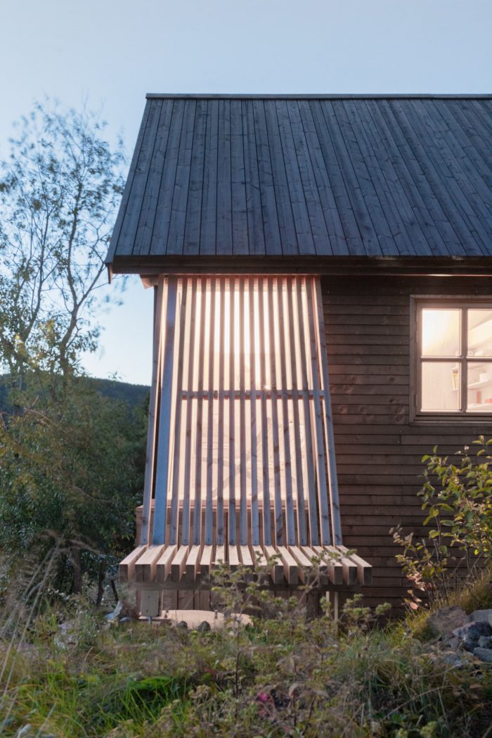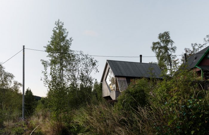 The cabin is placed just next to an older cabin, about the same size as the new one. Together the two form an angled courtyard which opens towards the sun and the main views to the southwest. A remake and enlargement of the old cabin was considered, but the client wanted to preserve the quality of the old one both in expression and material, and a remake-project was therefore abandoned. Instead the cabins are used in tandem, where the new one has all the modern facilities, such as water and electricity and the old one provides additional room for living and sleeping (in even more rudimentary conditions), when needed.